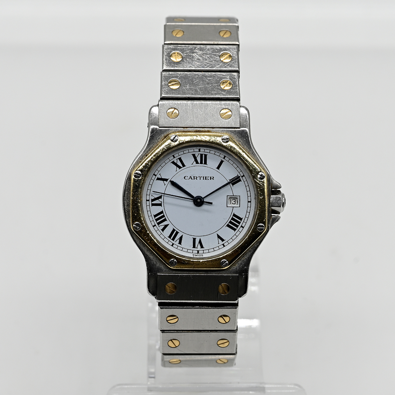 Steel and yellow gold; quartz movement; white enamel dial with black Roman numerals and date at 3 o’clock; blued, arrow-shaped hands and seconds hand; folding clasp; sapphire crystal; diameter of the octagonal bezel: approx. 27.3 mm; no guarantee on movement and function; 6 spare links.