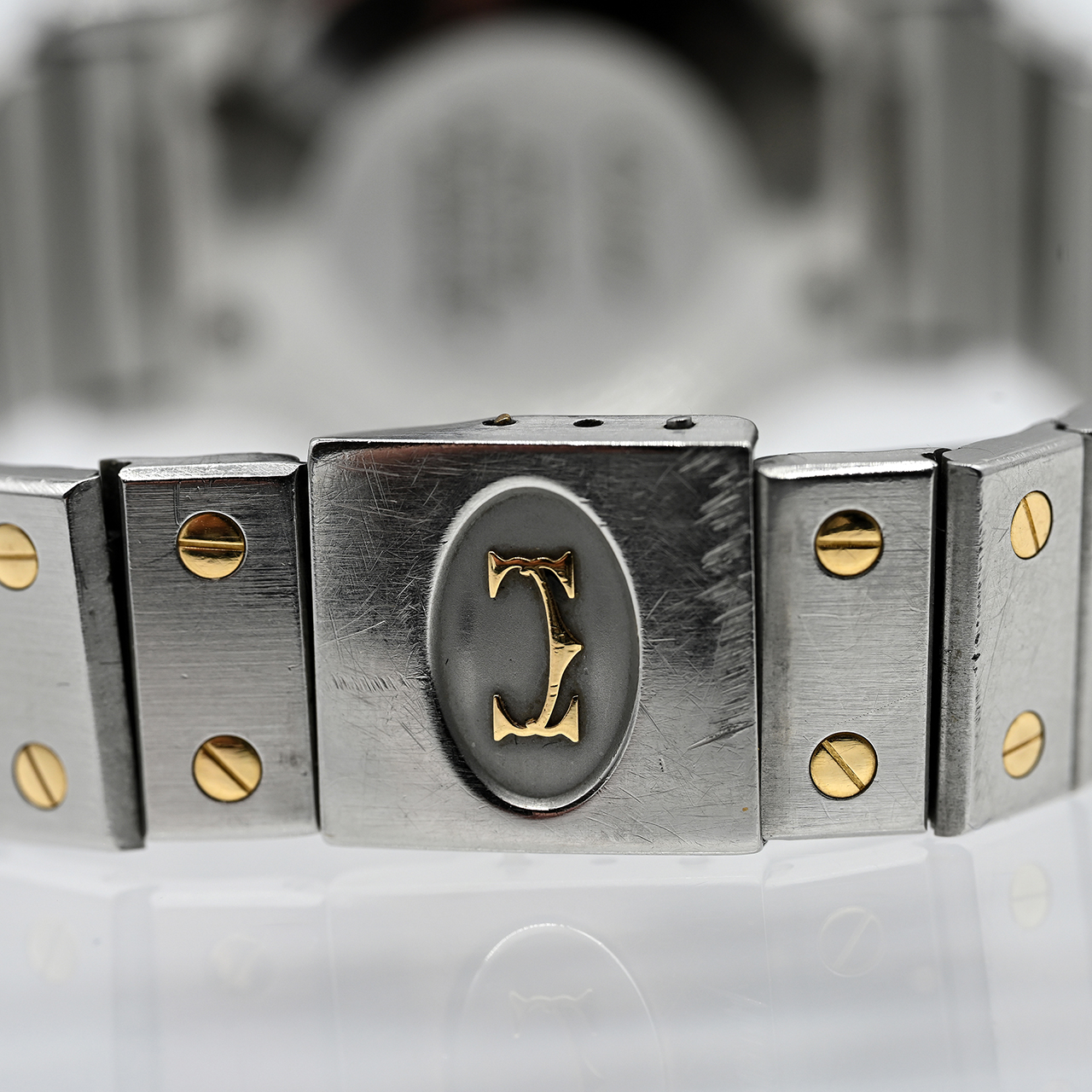 Stahl und Gelbgold; Quartzwerk; weißes Emaille-Zifferblatt mit schwarzen römischen Ziffern und Datum auf der 3; gebläute, pfeilförmige Zeiger und Sekunde; Faltschließe; Saphirglas; Durchmesser der oktagonalen Lünette: ca. 27,3 mm; keine Garantie auf Werk und Funktion; 6 Ersatzglieder.