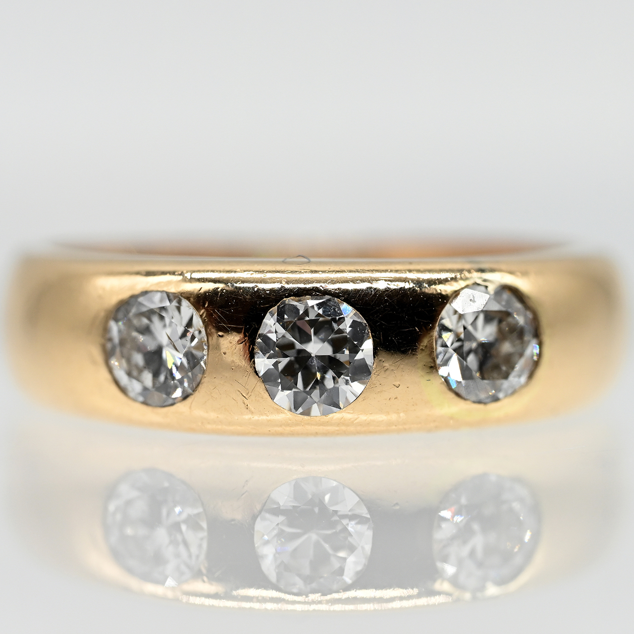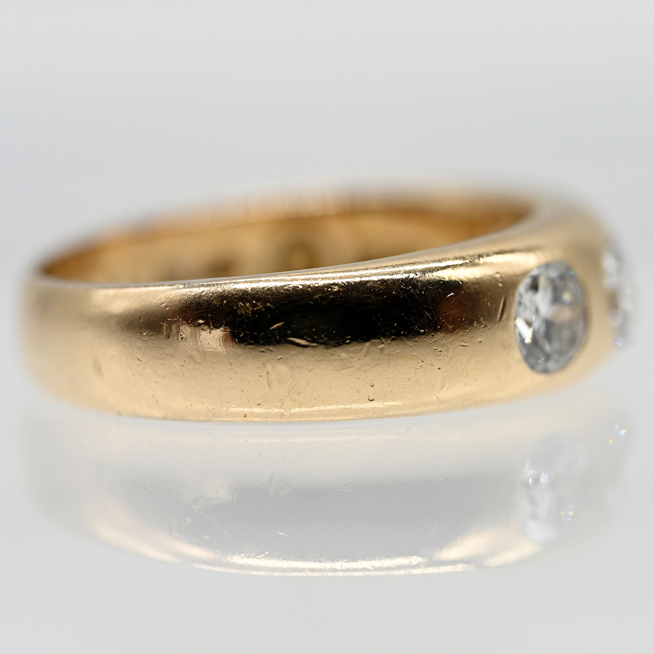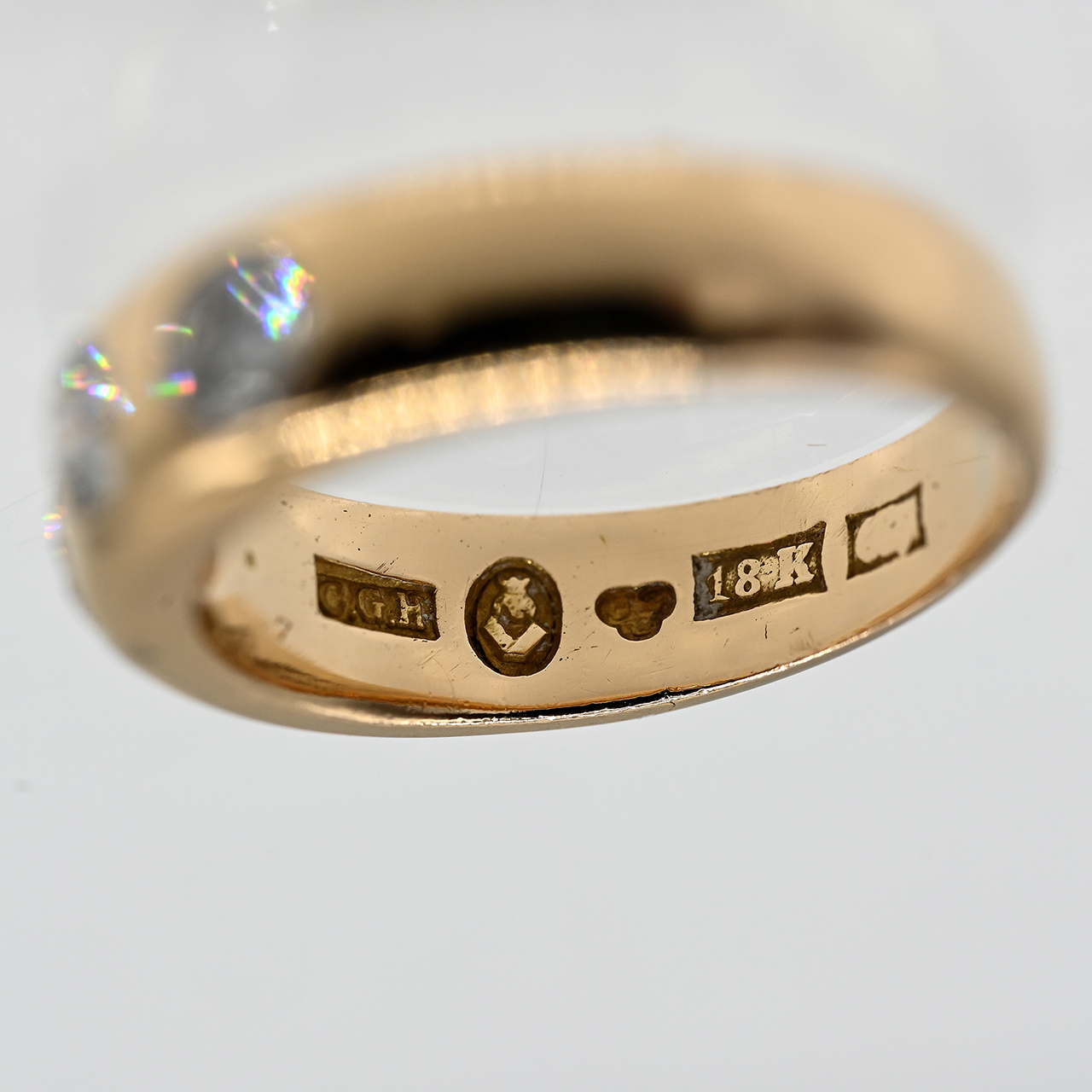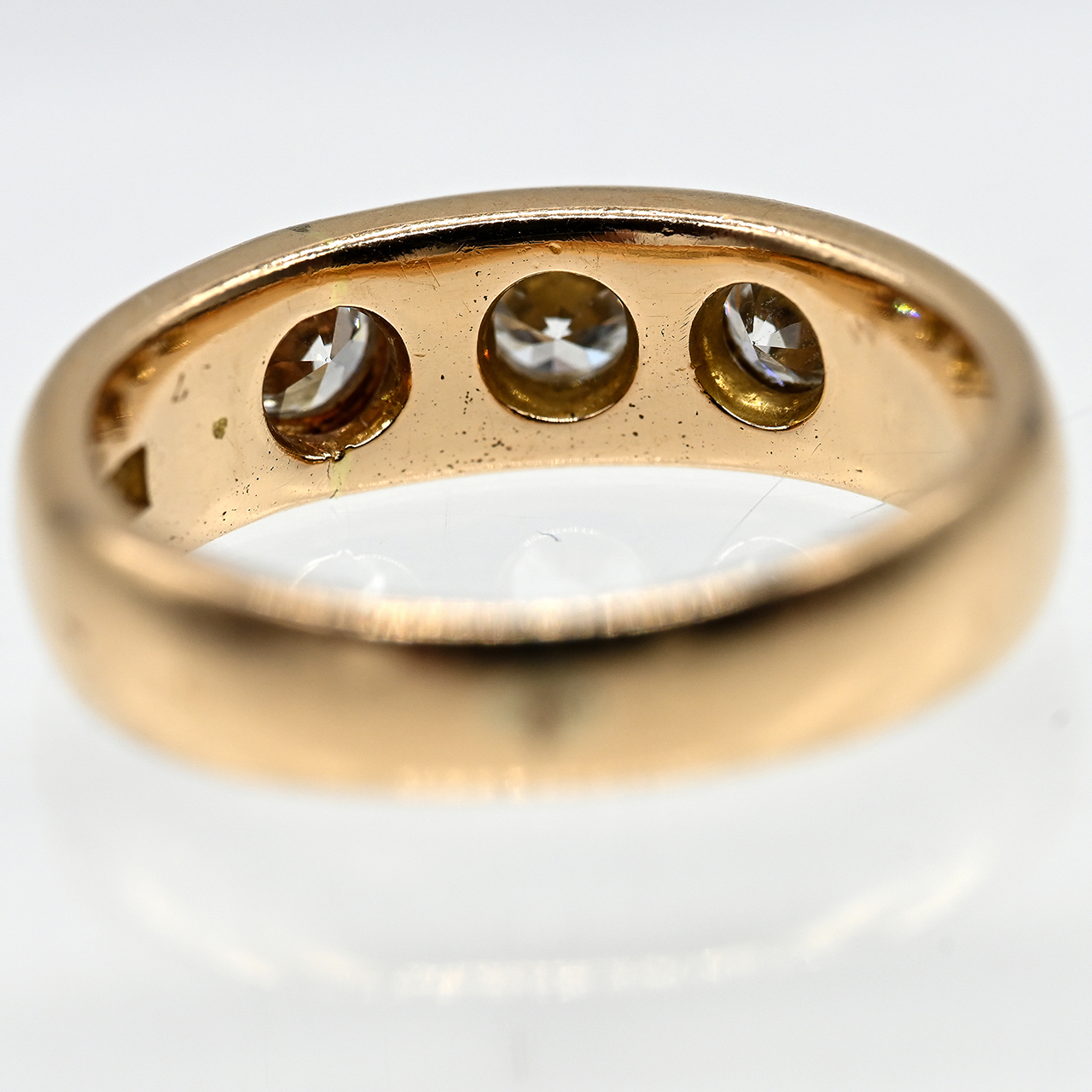 750/- yellow gold; total weight: approx. 6.7 g; narrow, slightly raised band form with tapered sides; on the front three set brilliant-cut diamonds, totalling approx. 0.72 ct: 1) one brilliant-cut diamond approx. 0.24 ct, colour: I; clarity: piqué 1. 2) one brilliant-cut diamond approx. 0.23 ct, colour: F; clarity: VVSI-VSI. 3) one brilliant-cut diamond approx. 0.25 ct, colour: H; clarity: SI; width of ring head: approx. 5.7 mm; height: approx. 3.5 mm; inside of shank stamped C.GH and three crowns; ring size: 54.
