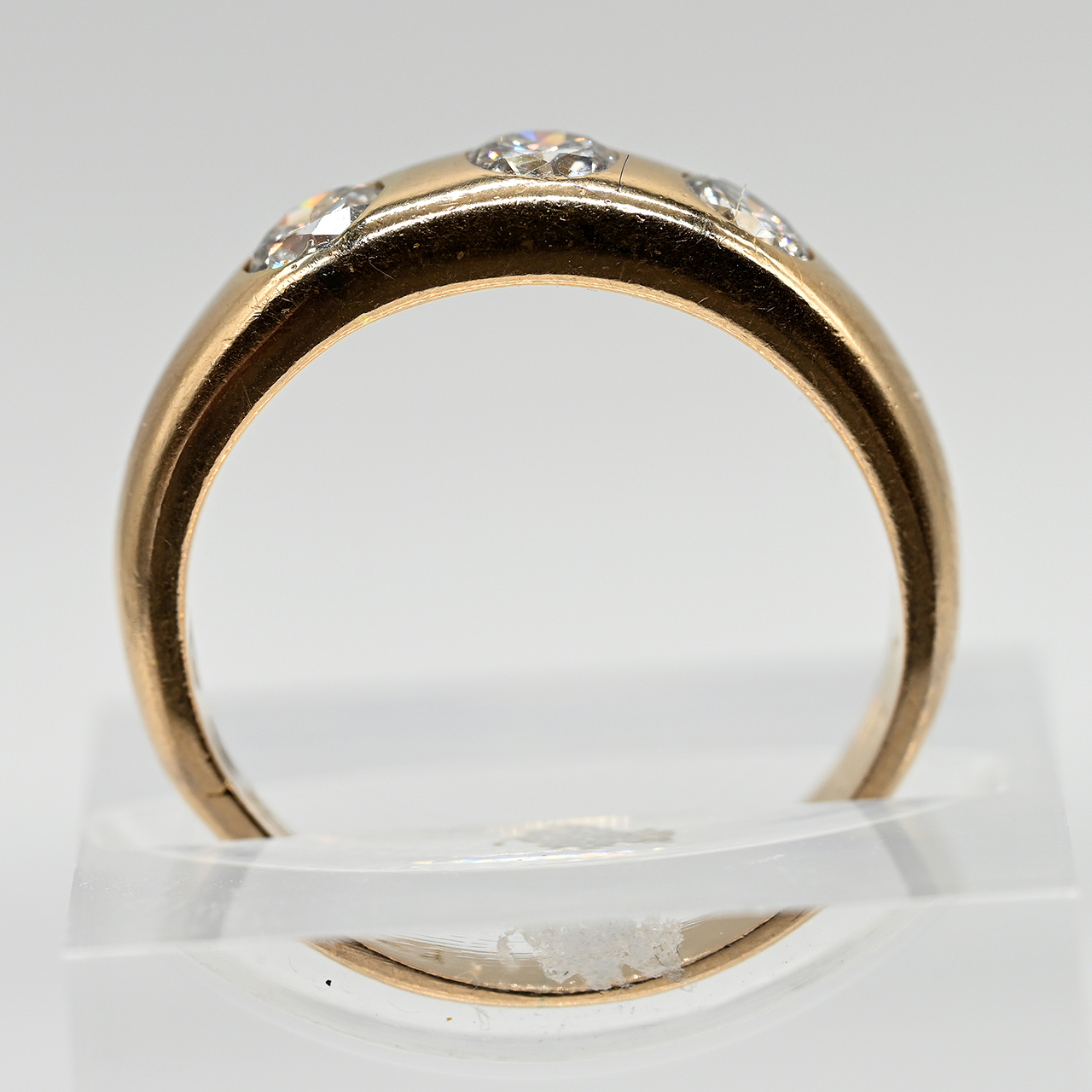 750/- Gelbgold; Gesamtgewicht: ca. 6,7 g; schmale, leicht erhöhte Bandform mit seitlichem Verlauf; auf der Schauseite drei gefasste Brillanten, zus. ca. 0,72 ct: 1) ein Brillant ca. 0,24 ct, Farbe: I; Reinheit: Piqué 1. 2) ein Brillant ca. 0,23 ct, Farbe: F; Reinheit: VVSI-VSI. 3) ein Brillant ca. 0,25 ct, Farbe: H; Reinheit: SI; Breite der Ringmitte: ca. 5,7 mm; Höhe: ca. 3,5 mm; in der Ringschieneninnenseite gestempelt C.GH und drei Kronen; Ringgröße: 54.