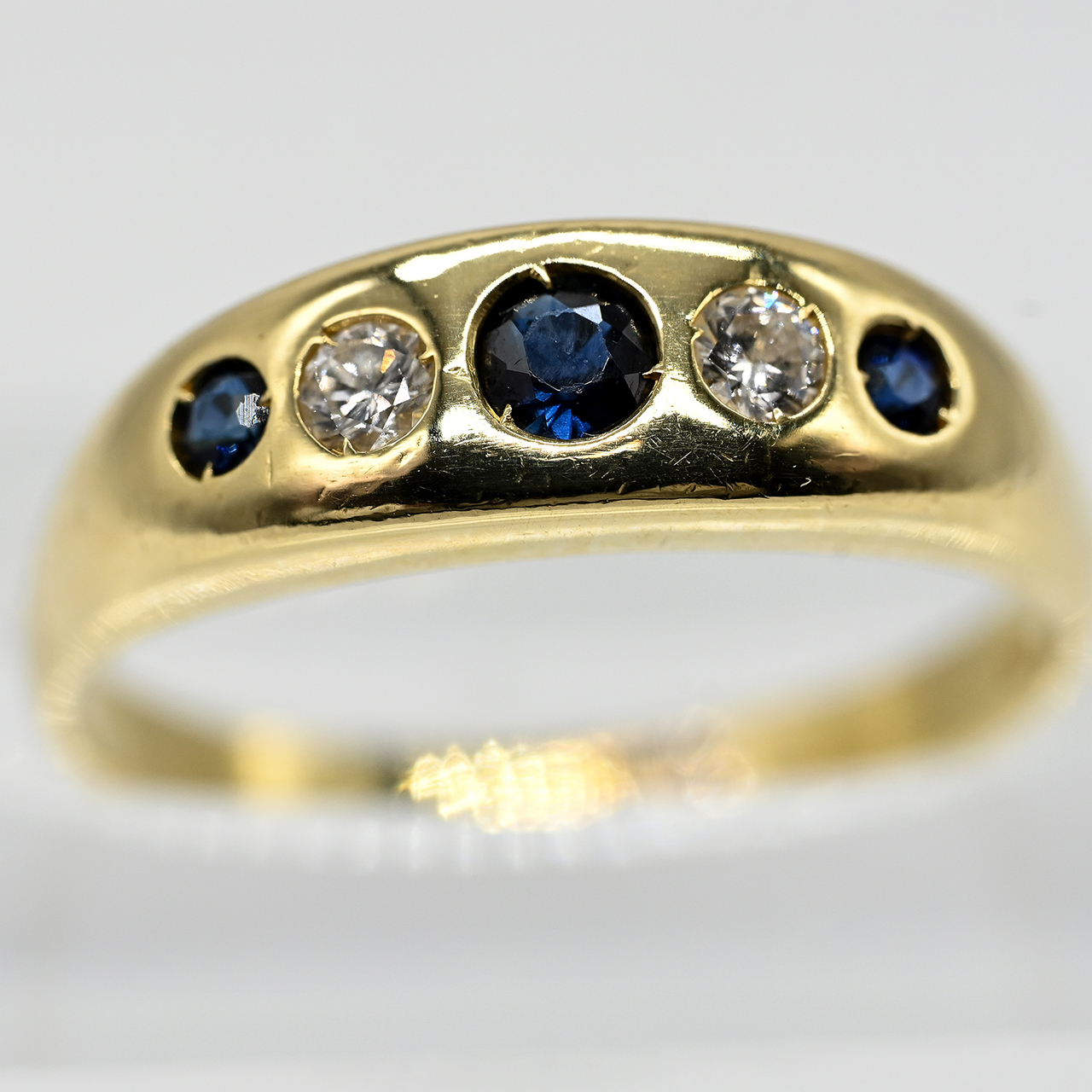 750/- yellow gold; total weight: approx. 3.5 g; domed ring head with tapered sides; centre set with three sapphires in an intense dark blue colour variety, divided by two diamonds, totalling approx. 0.1 ct; colour and clarity in the upper range; width of ring head: approx. 5.6 mm; height: approx. 3.3 mm; ring size: 56.