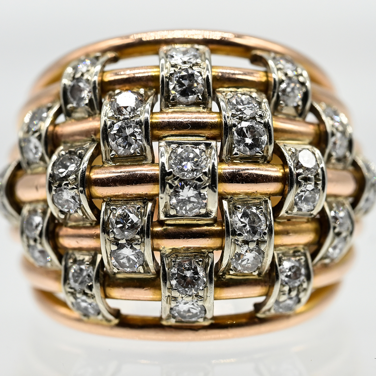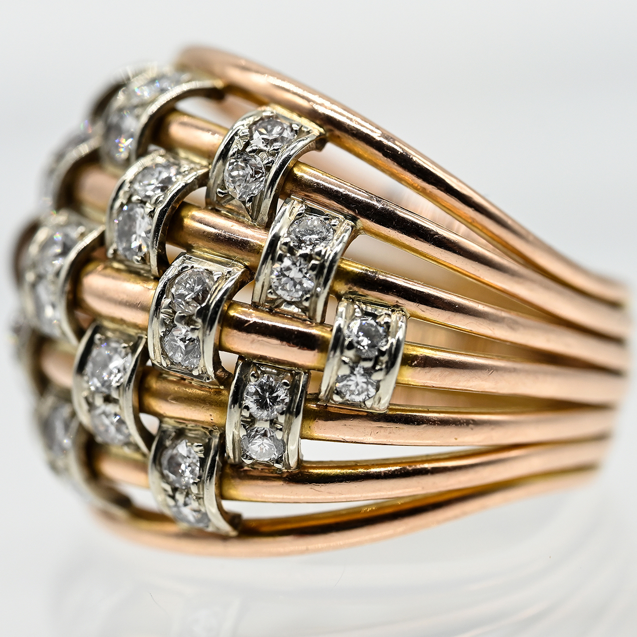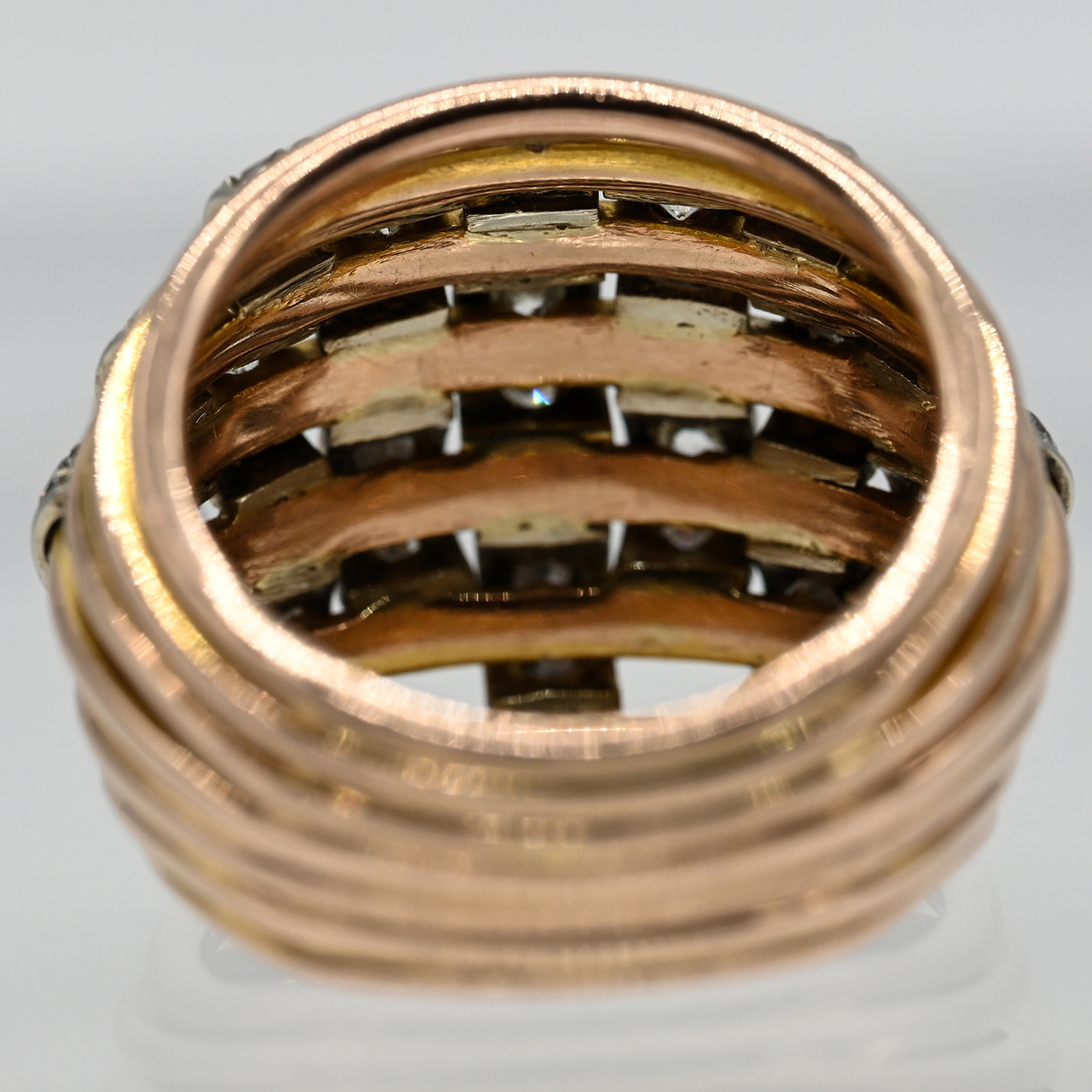 585/- Rosé- und Weißgold; Gesamtgewicht: ca. 11 g; gewölbte Fächerform, aus sieben Ringen gearbeitet; verbunden durch 19 weißgoldene Stege in stilisierter Flechtmusteroptik; ausgefasst mit 38 Brillanten, zus. ca. 1,4 ct; Farbe und Reinheit im oberen Bereich; Maße der Ringmitte: ca. 19,4 mm; Höhe: ca. 6,5 mm; Ringgröße: 52.