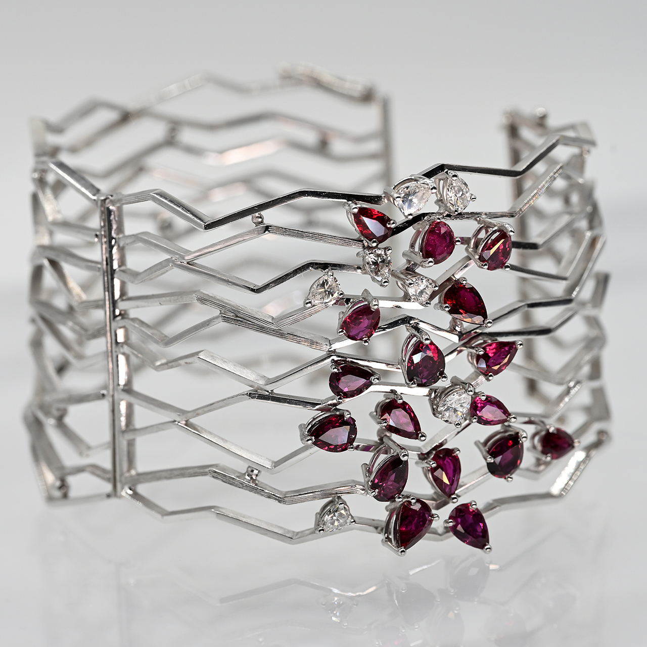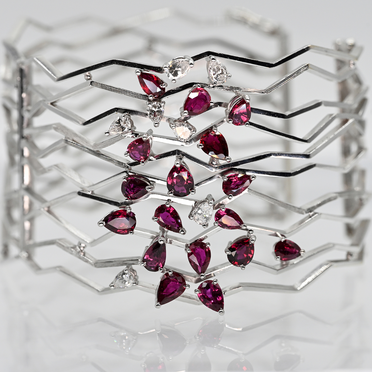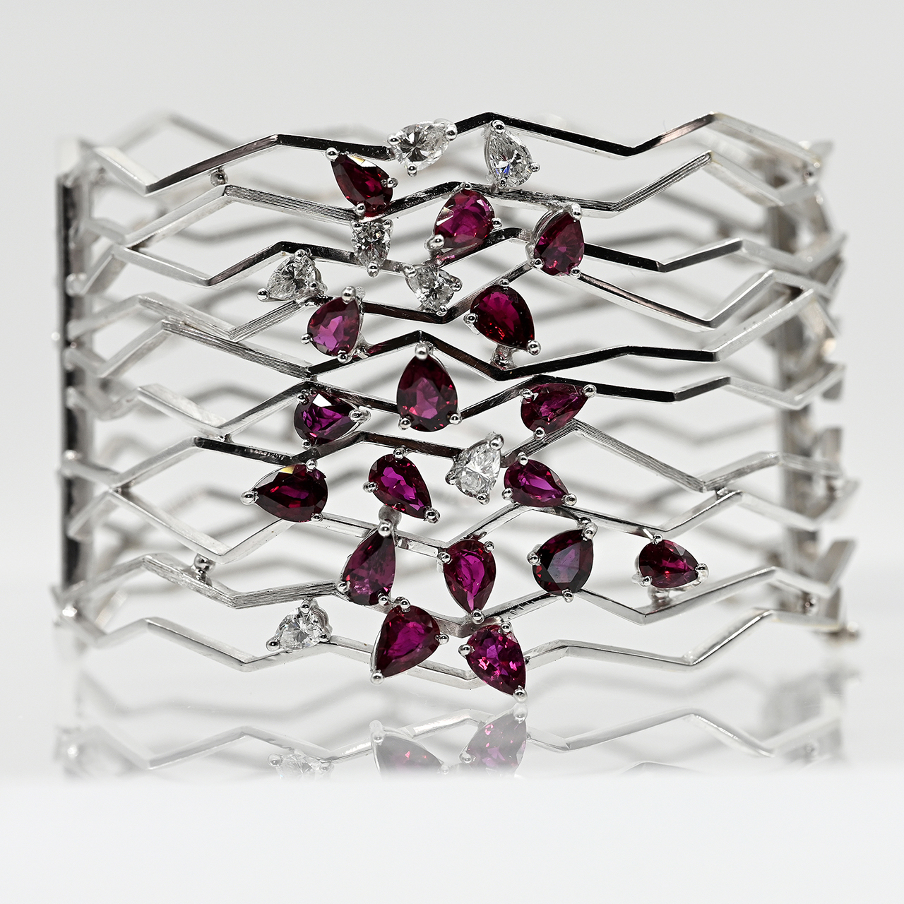 585/- Weißgold; Gesamtgewicht: ca. 55,1 g; breite, leicht ovale, aufklappbare Reifform aus 10 einzelnen, nebeneinander liegenden, gezackten, vierkantigen Drähten, mit teils schraffierter und polierter Oberflächenstruktur; auf der Schauseite unregelmäßig angeordnete auf- und eingesetzte Krappenfassungen; ausgefasst mit 17 Rubinen im Tropfenschliff, zus. ca. 5,5 ct; hochwertige, rot-violette Farbvarietäten mit sehr leichten, unterschiedlichen Farbnuancen und Einschlüssebildern; konturiert von 7 tropfenförmigen Diamanten, zus. ca. 0,9 ct; Farbe: E-G; Reinheit: VVSI-VSI; verdecktes Kastenschloss mit seitlichen Sicherheitsachten; Breite des Armreifens: ca. 42,2 mm; Reifinnenmaße: ca. 5,5 x 5,2 mm; ein Rubin mit kleinem Chip unter der Krappe.
