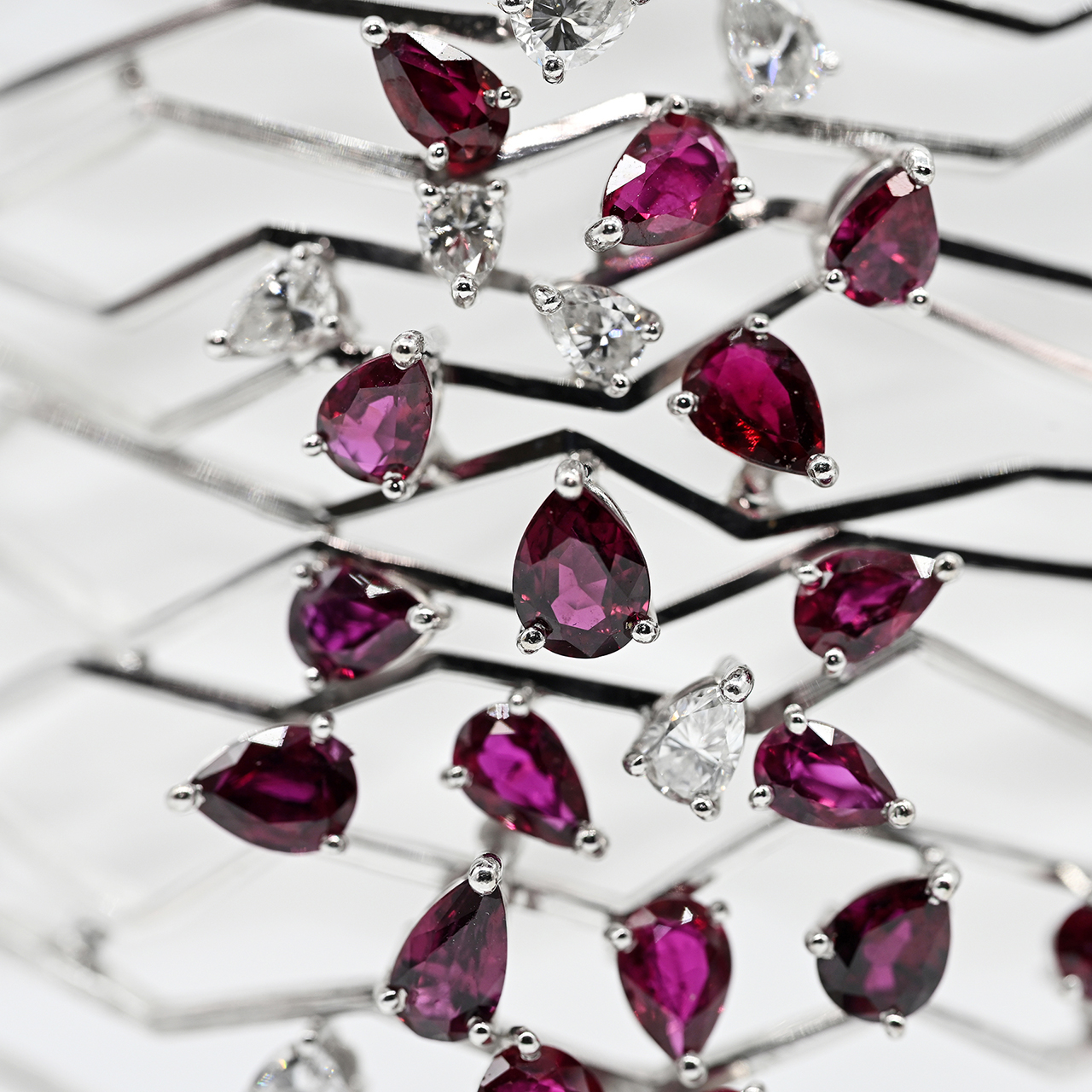 585/- white gold; total weight: ca. 55.1 g; broad, slightly oval, hinged form composed of 10 individual, adjoining, serrated, square wires with partly hatched and polished surface structure; front with irregularly arranged prong settings, set with 17 pear-cut rubies, total ca. 5.5 ct; high-quality red-violet varieties with very slight, differing nuances of colour and inclusions; contoured by 7 pear-cut diamonds, total ca. 0.9 ct; colour: E-G; clarity: VVSI-VSI; concealed box clasp with side safety eights; width of bangle: ca. 42.2 mm; inner dimensions: ca. 5.5 x 5.2 mm; one ruby with small chip under the prong.