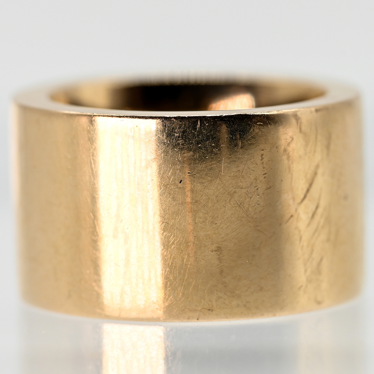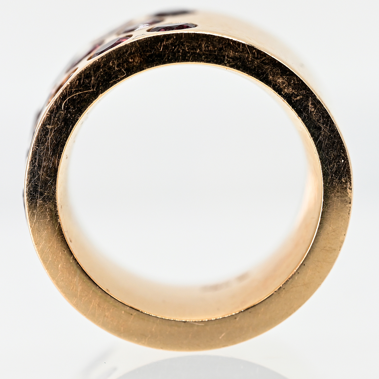 750/- Gelbgold; Gesamtgewicht: ca. 16,4 g; breite, massive Ringschiene; auf der Schauseite 20 gefasste runde, facettierte Turmaline in pinkfarbener Farbvarietät; Breite des Ringes: ca. 12,8 mm; Stärke: ca. 3 mm; Ringgröße: 51,5.