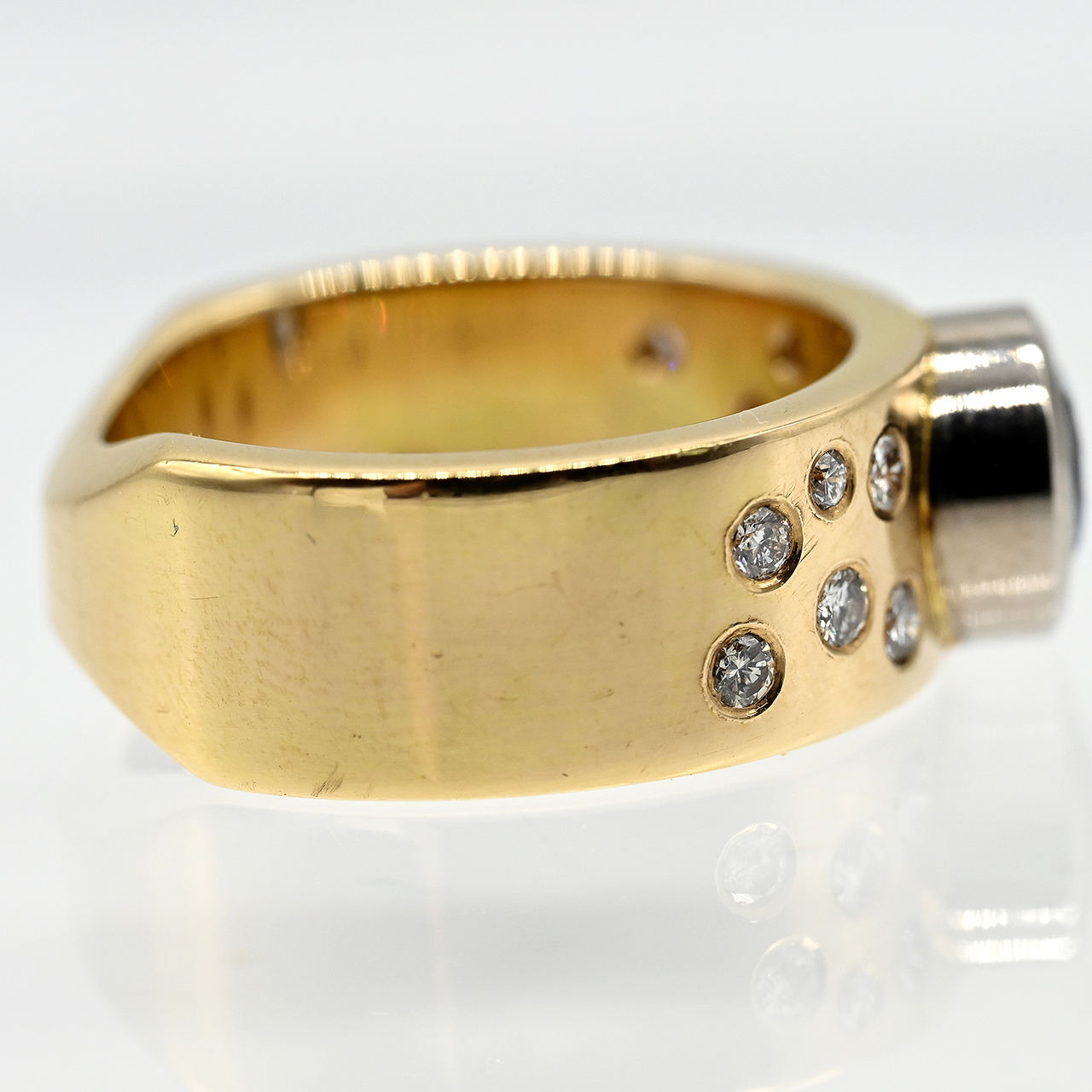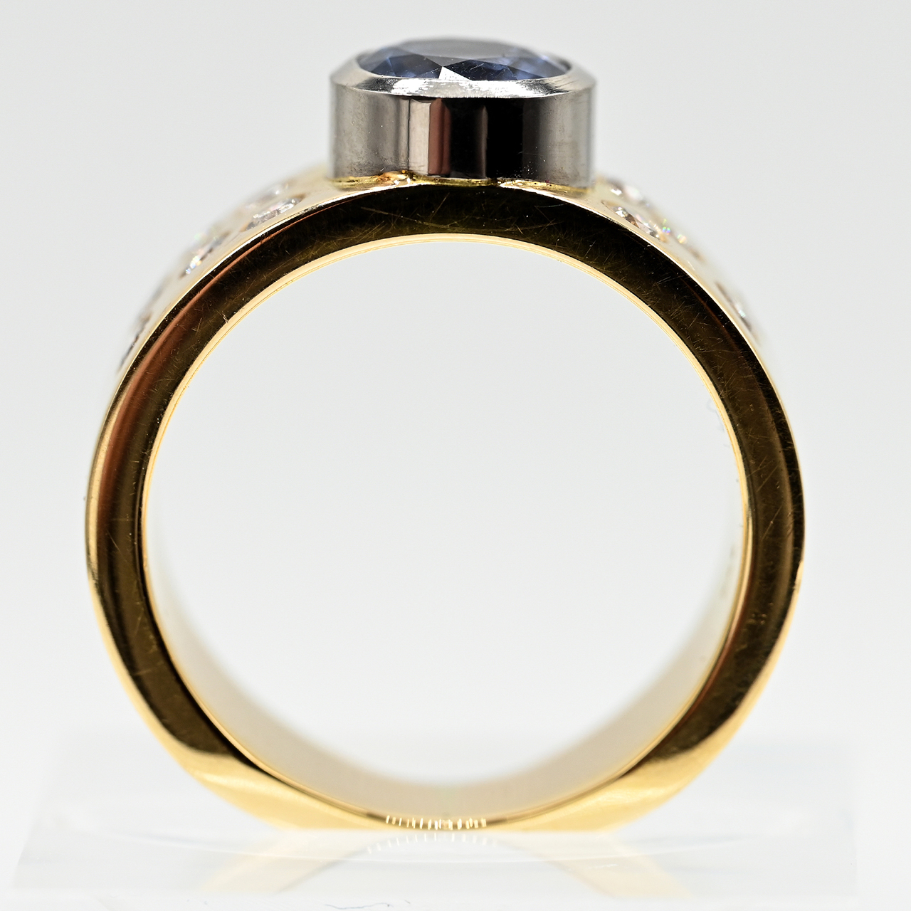 750/- Gelb- und Weißgold; Gesamtgewicht: ca. 13,9 g; breite, massive Bandform; rückseitig mit abgeschrägten Kanten; in weißgoldener, aufgesetzter, runder Zargenfassung gefasster, facettierter Tansanit in heller blau-violetter Farbvarietät; Durchmesser: ca. 7 mm; Höhe: ca. 6 mm; seitlich auf den Ringschultern jeweils 5 und 6 gefasste Brillanten, zus. ca. 0,2 ct; Farbe: F-H; Reinheit: VS1-SI; Breite der Ringschiene: ca. 8,1 mm; mittige Höhe: ca. 5,3 mm; Ringgröße: 54.
