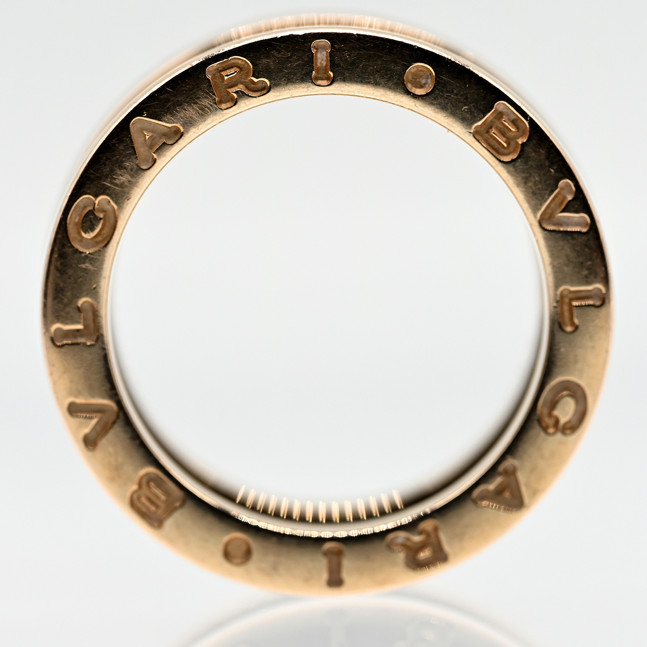 750/- Ring; Gesamtgewicht: ca. 7,8 g; 3-fach, schwarze Keramik, seitlich eingefasst vom goldenen Ring; außen auf beiden Seiten mit doppeltem BVLGARI-Schriftzug graviert; Breite des Ringes: ca. 8,4 mm; Ringgröße: 52; auf der Innenseite der Ringschiene bezeichnet und gestempelt.