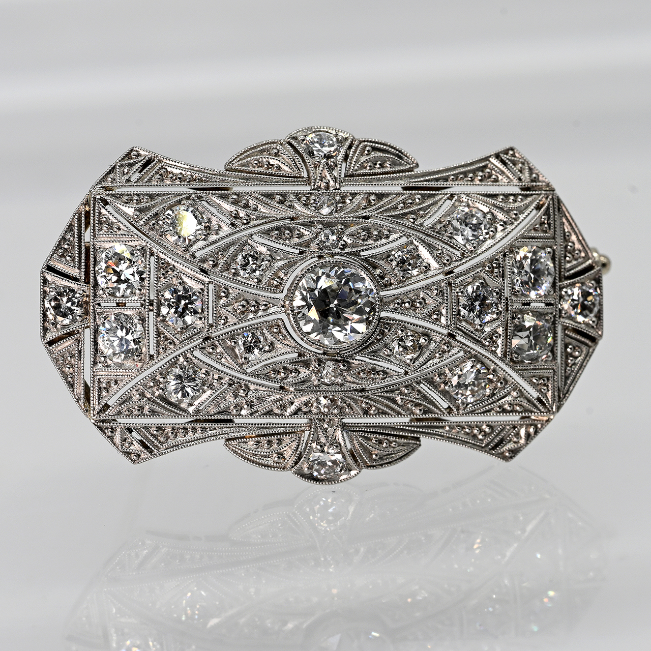 585/- Weißgold; Gesamtgewicht: ca. 10,5 g; mehrpassige, gewölbte Rechteckform mit geometrischem à-jour-Sägeschnitt; mittig in leicht erhöhter Chatonfassung gefasster Altschliff-Diamant ca. 0,74 ct; Farbe: I-K; Reinheit: Piqué 1; umrahmt von 23 Diamanten, zus. ca. 1,59 ct; Farbe: G-K; Reinheit: VSI1-Piqué 2; Maße: ca. 24,7 × 39,2 mm; Höhe: 6,7 mm.