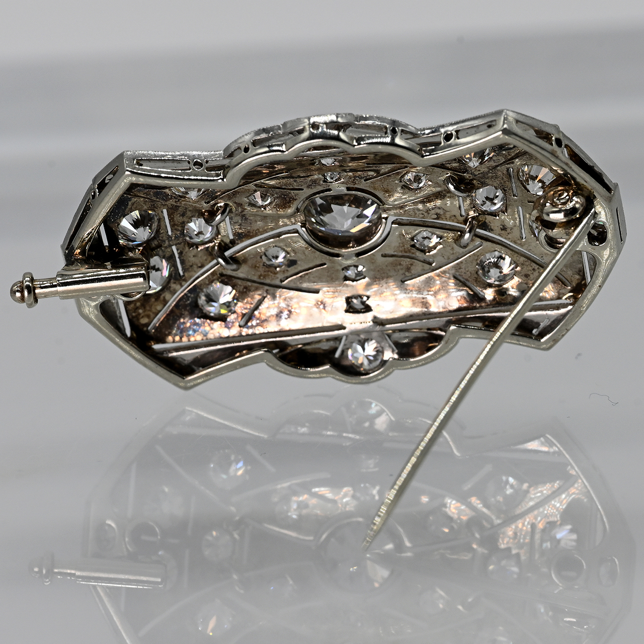 Brosche mit reichhaltigem Diamantenbesatz in verschiedenen Schliffformen, zus. ca. 2,3 ct, im Art Déco Stil
