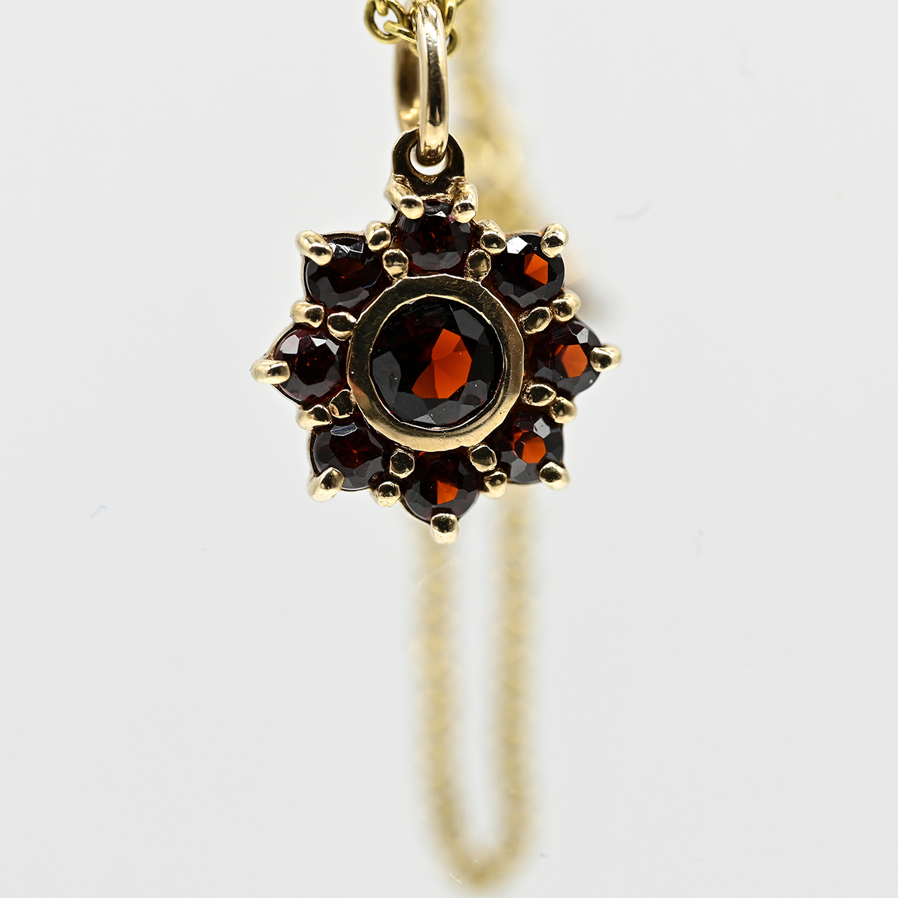 333/- yellow gold; total weight: approx. 2.9 g; small rosette-shaped pendant set with faceted garnets; diameter: approx. 10.8 mm; fine anchor chain necklace; total length: approx. 45 cm.