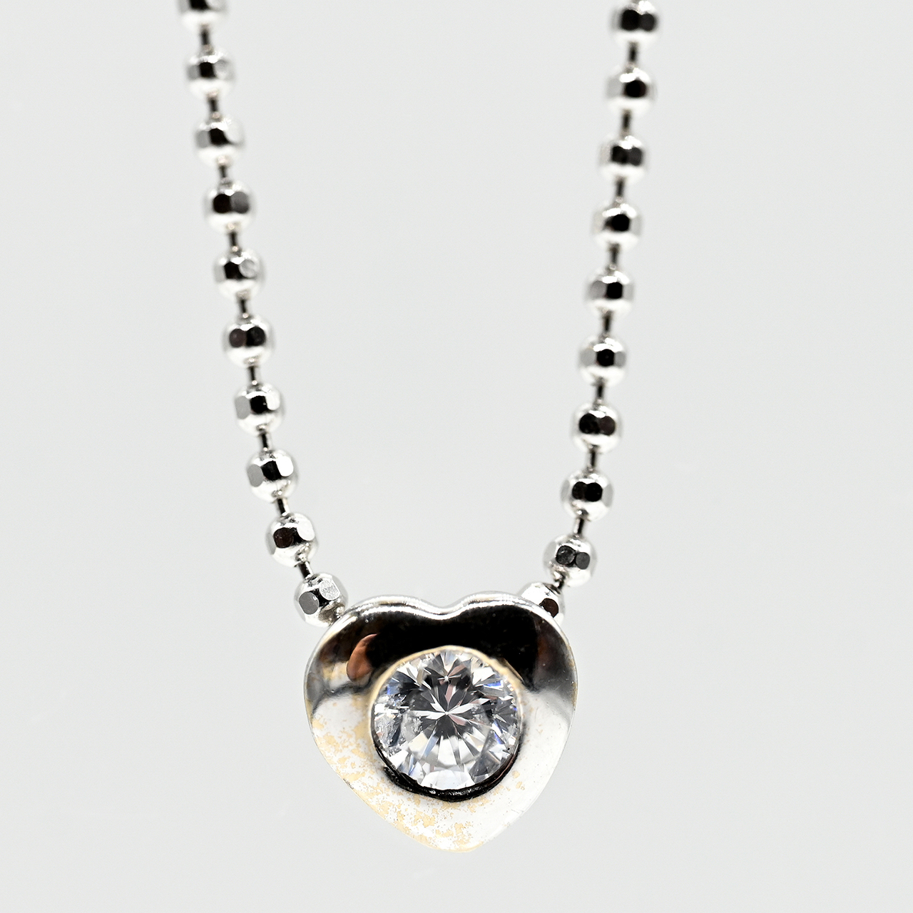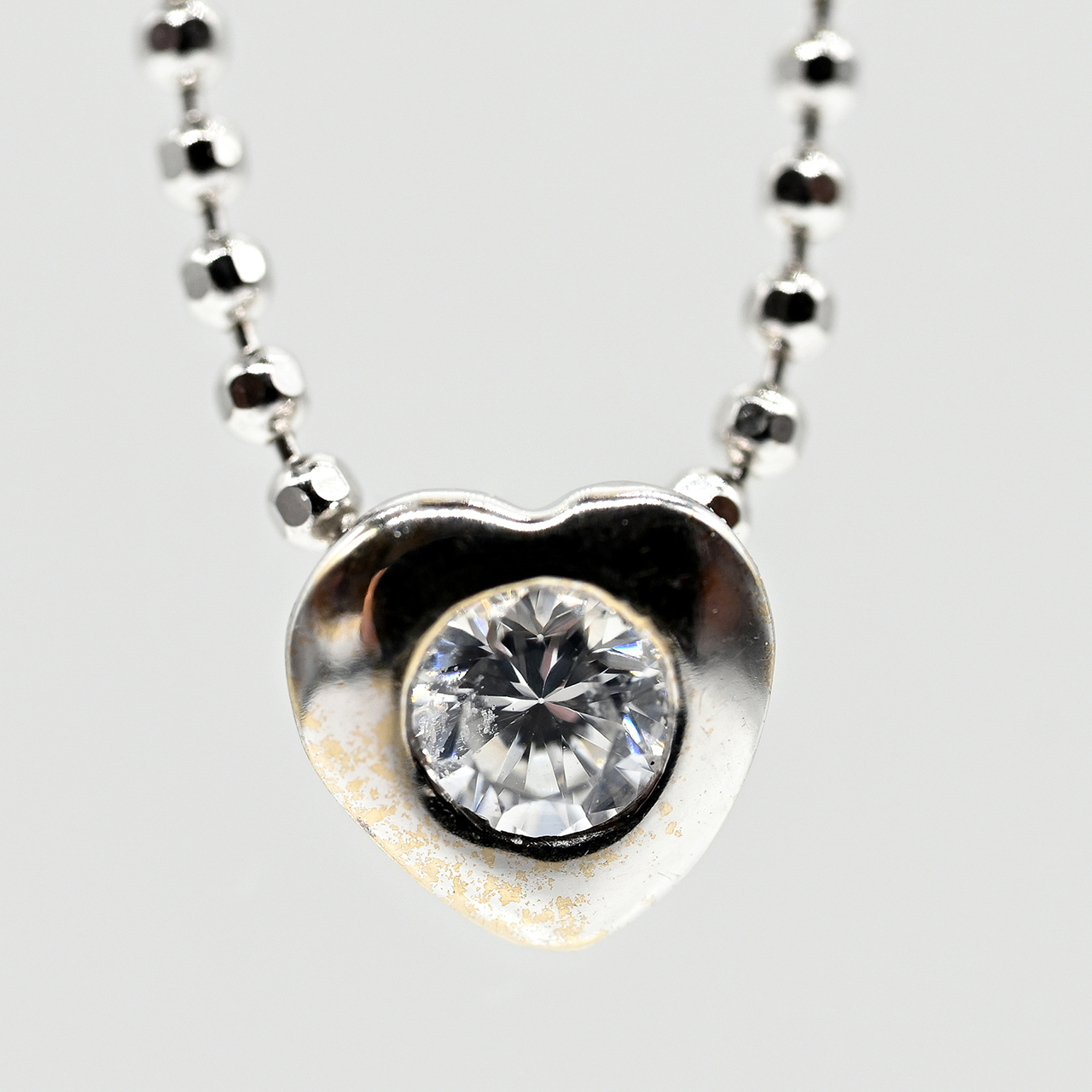750/- white gold; total weight: approx. 3 g; finely faceted bead chain pattern with small semi-plastic heart pendant; centre set with a brilliant-cut diamond, approx. 0.15 ct; colour: H-J; clarity: piqué; dimensions of pendant: approx. 5.7 x 6 mm; height: approx. 3.1 mm; necklace length: approx. 44 cm.