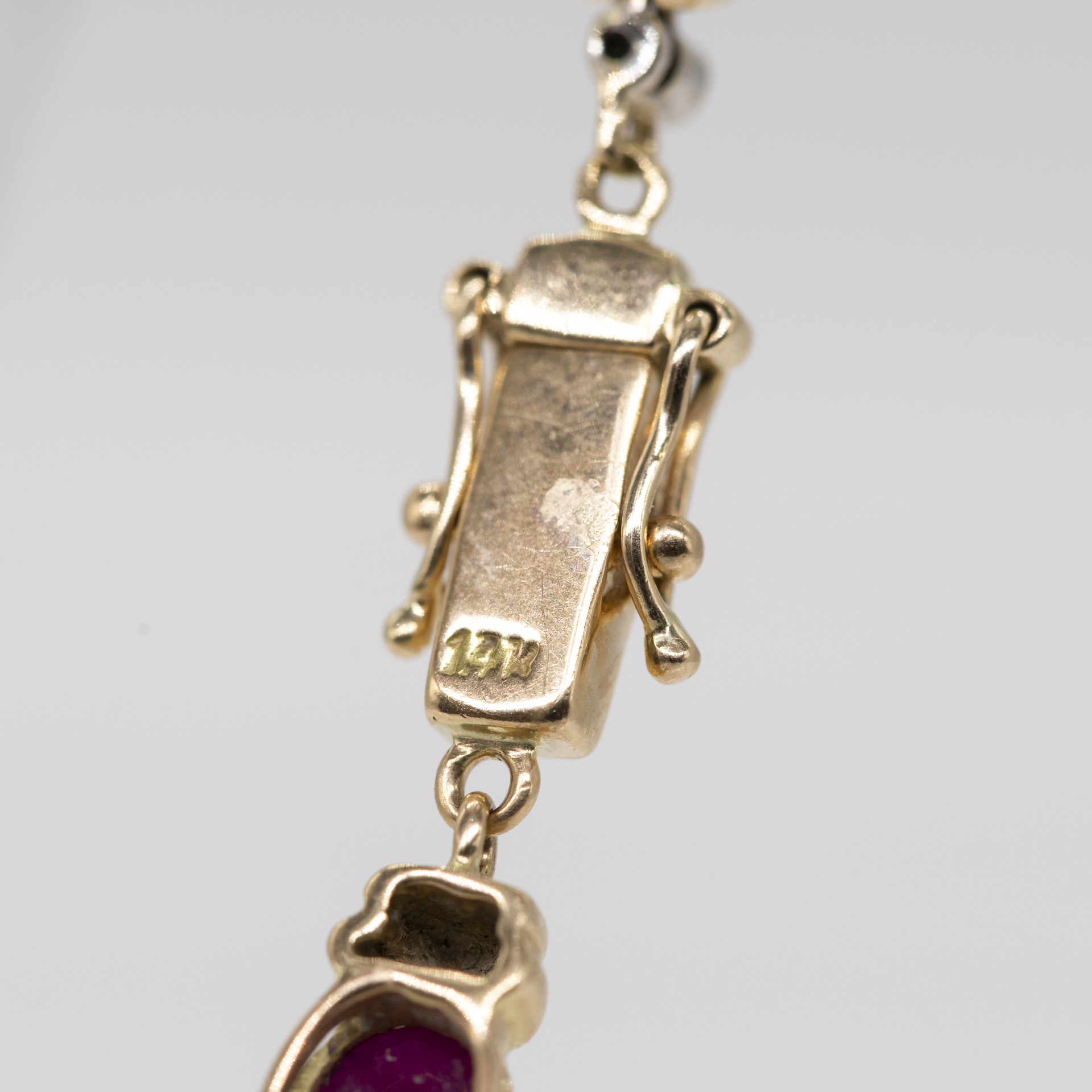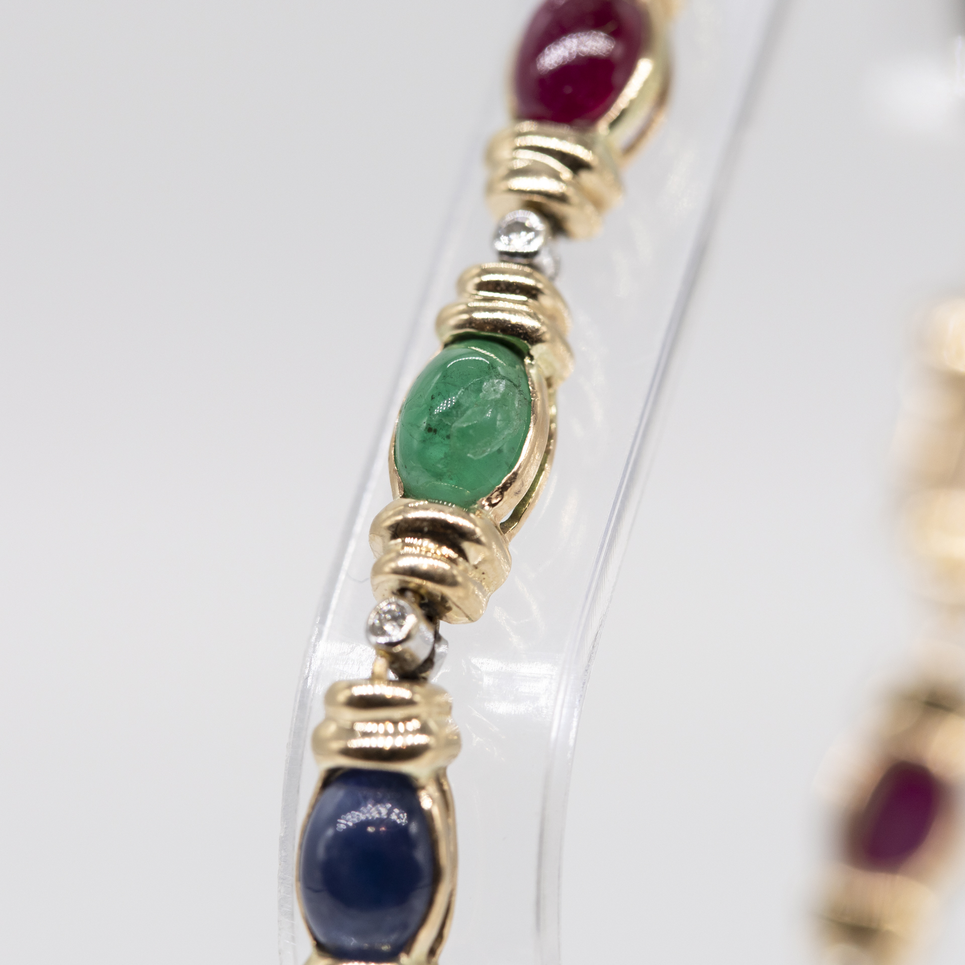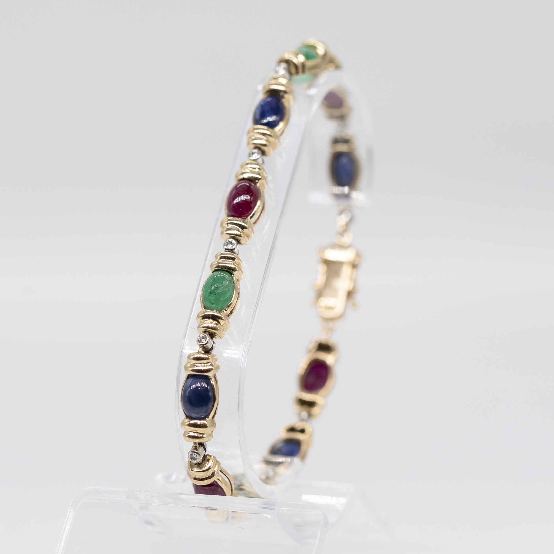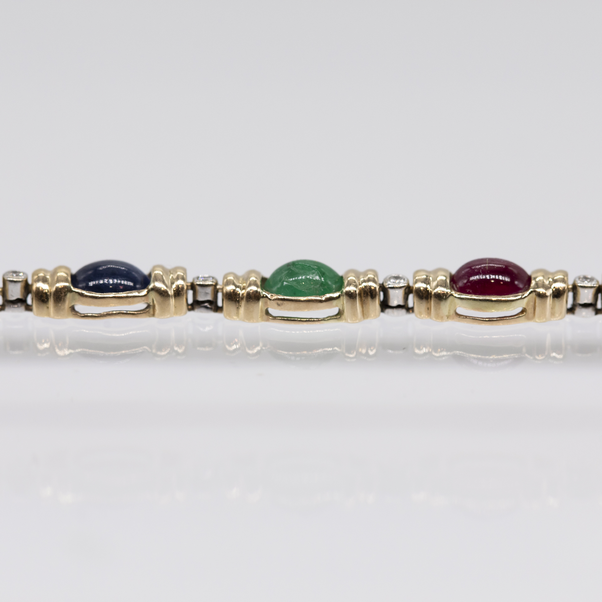 585/- Gelb- und Weißgold; Gesamtgewicht: ca. 16,5 g; querovale, abwechselnd gefasste 4 Saphir-, 4 Rubin- und 3 Smaragd-Cabochons in sehr guter Farbvarietät; abgegrenzt von zweifach profilierten Seitenteilen und unterteilt von 11 kleinen weißgoldenen Chatons, jeweils mit einem Achtkant-Diamanten besetzt; Kastenschloss mit seitlichen Sicherheitsachten; Breite des Armbandes: ca. 5,5 mm; Gesamtlänge: ca. 18,5 cm.