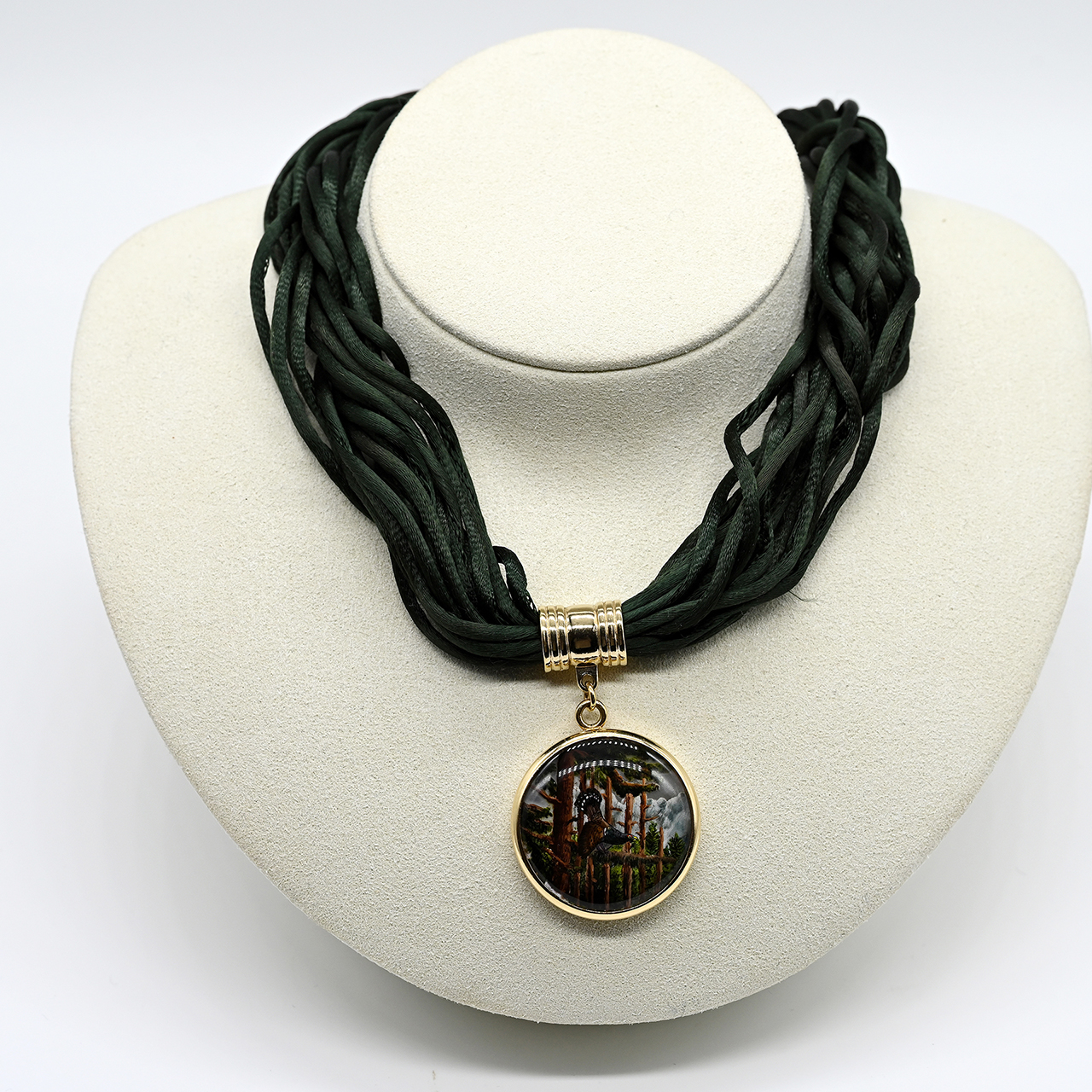 Golden pendant with rock crystal cabochon and mother-of-pearl, finely painted polychrome hunting scene, France; necklace of 15 green textile strands by Frey Wille, 1980s