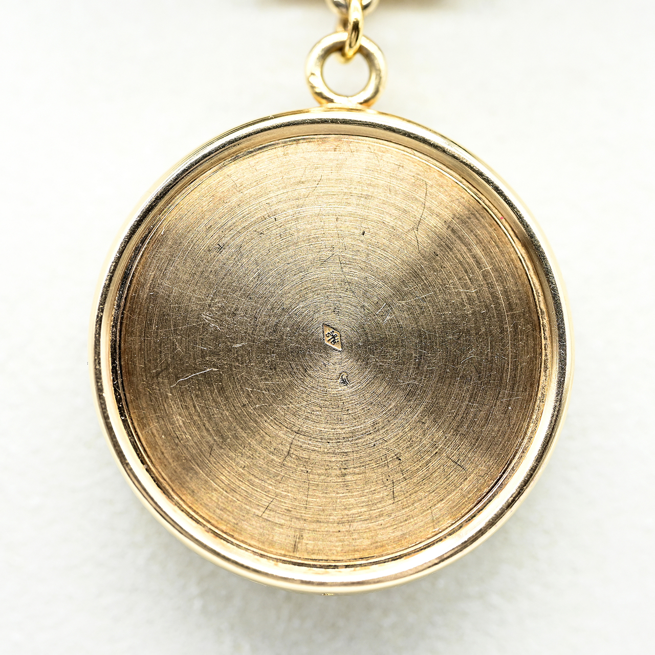 750/- Gelbgold; Gesamtgewicht des Anhängers: ca. 18,9 g; runder Anhänger mit schlichter Zargenfassung und rückseitiger Verbödung; gefasster Bergkristall-Cabochon; dahinterliegende Perlmuttplatte mit fein gemaltem Bild eines Tannenwaldes und schemenhaftem Bergmassiv im Hintergrund, im Vordergrund auf einer Astgabel sitzender Auerhahn; Durchmesser: ca. 31,2 mm; Höhe: ca. 7 mm.