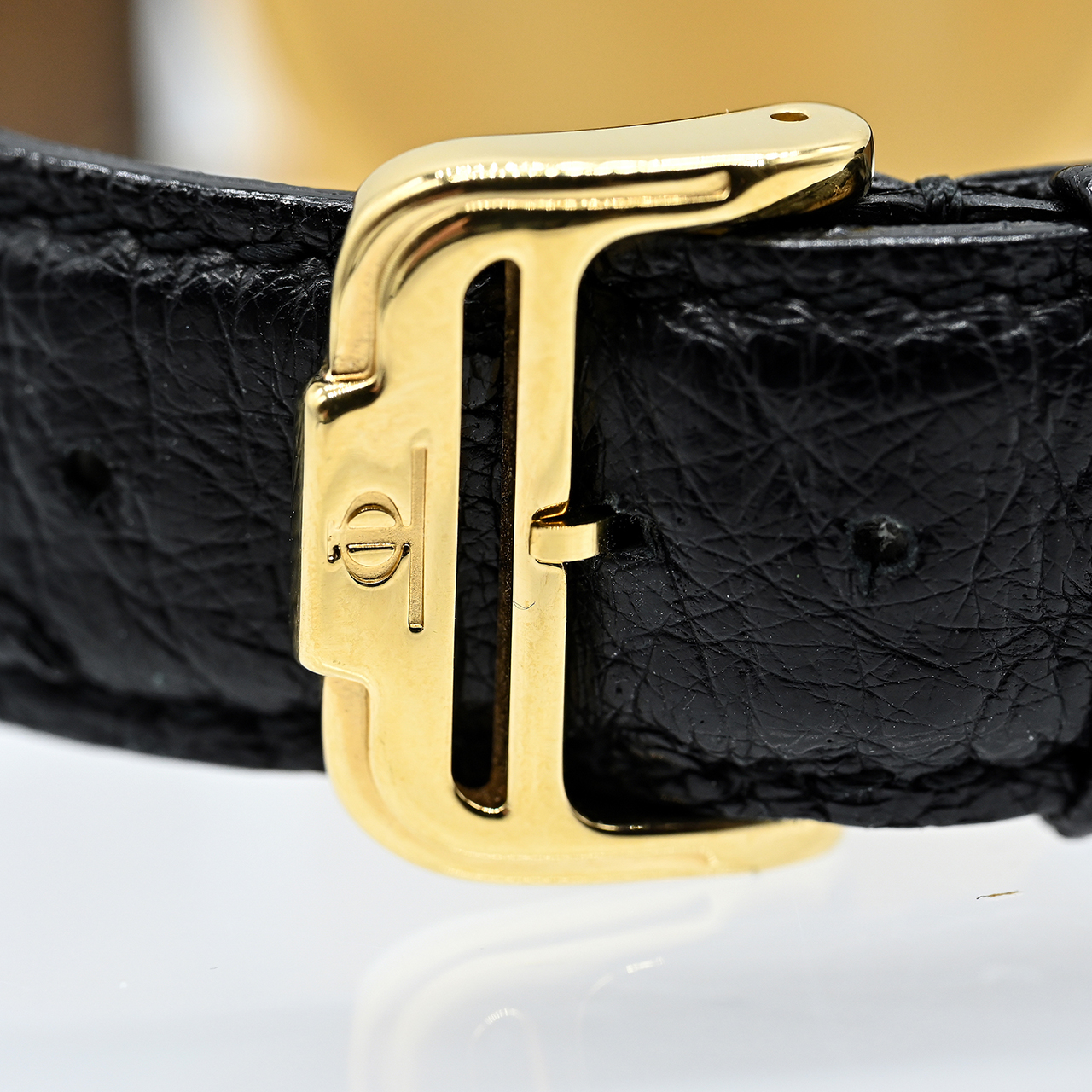 18 kt Gelbgold mit schwarzem Lederarmband und originaler, goldfarbener Dornenschließe; Quarzwerk; weißes Zifferblatt mit schwarzen römischen Ziffern und pfeilförmigen, gebläuten Zeigern; schmaler, profilierter Lünettenrand; Seriennr. 3576992; im Originaletui mit Gebrauchsanweisung und Garantie von Wempe, Hamburg, 13.12.03.; keine Garantie auf Werk und Funktion.