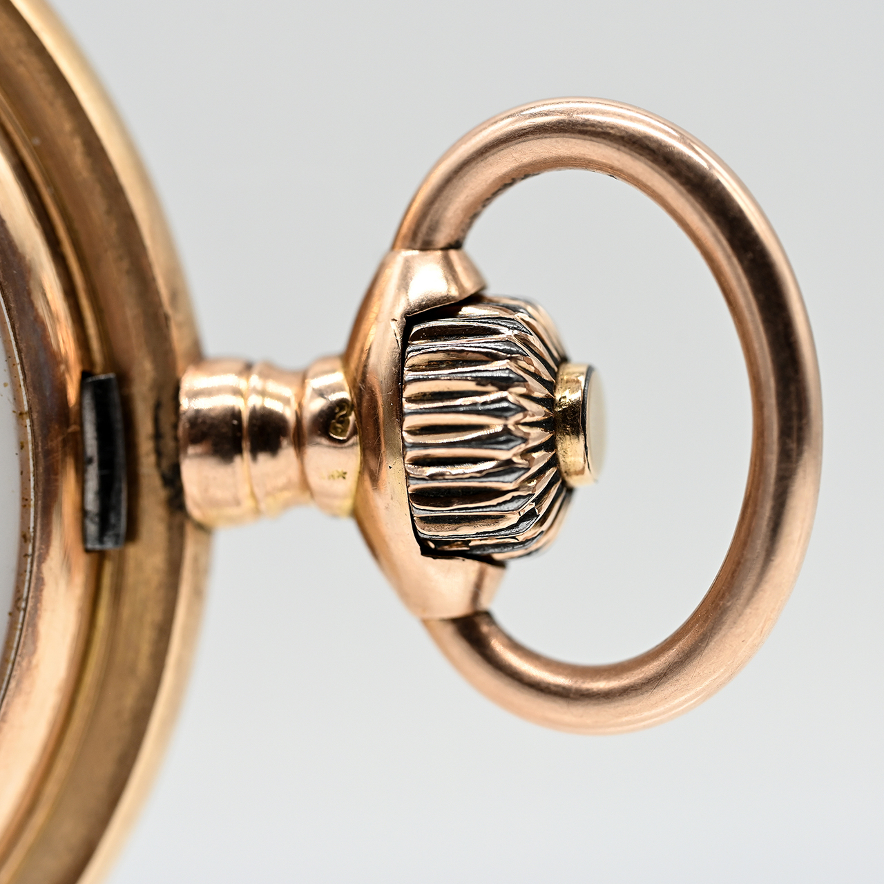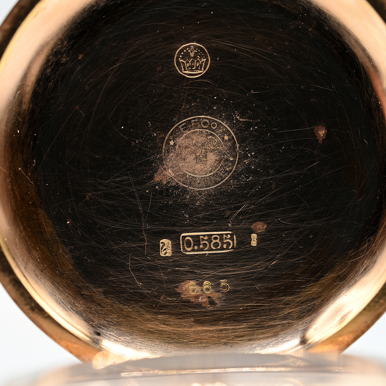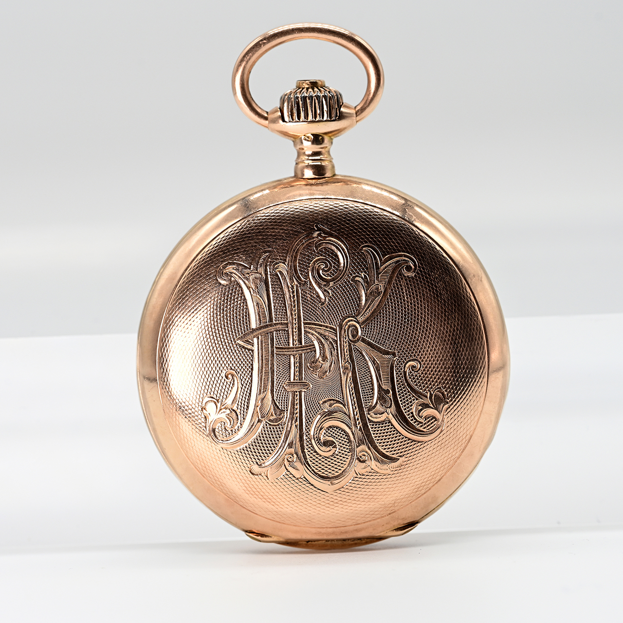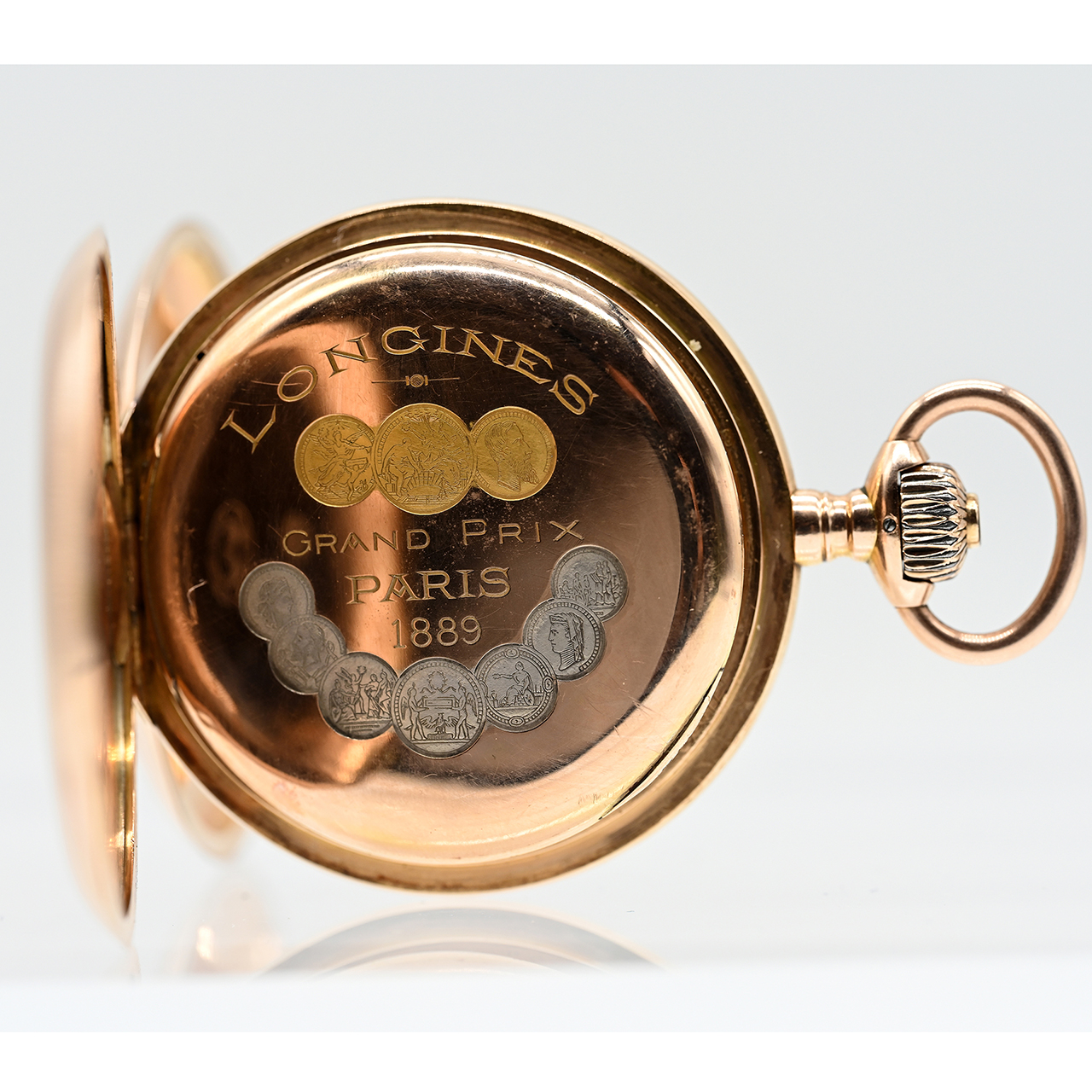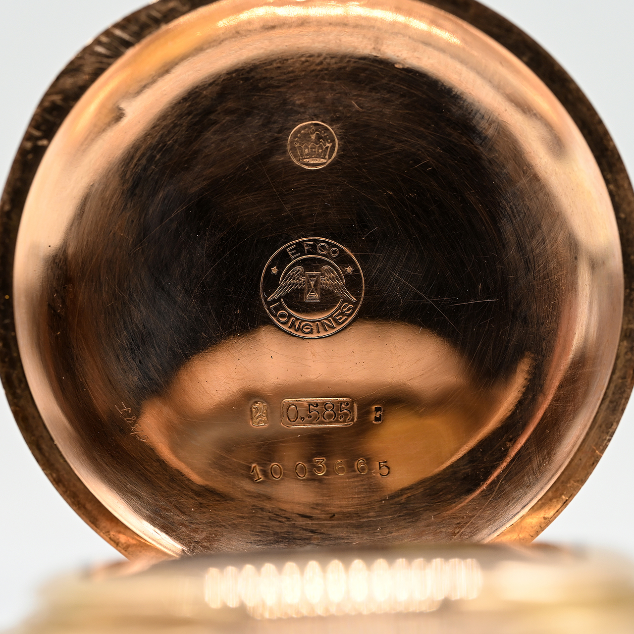 585/- Roségold, inkl. Sprungdeckel; Gesamtgewicht: ca. 109,1 g; Seriennummer: 1´003´665; Kaliber: 19.58; Handaufzug; weißes Emaillezifferblatt mit schwarzen arabischen Ziffern und kleiner Sekunde auf der 6; goldfarbene Filigranzeiger; Herstellernummer: 1003665; Schau- und Rückseitenfläche mit feinem kornguillochiertem Dekor; auf der Schauseite aufwendiges, fast flächendeckendes, legiertes Monogramm „HK“; schriftlicher Beleg von Longines aus der Schweiz bestätigt, dass die Taschenuhr am 30.09.1899 in der damaligen Filiale in Berlin erworben wurde (Kopie des Schreibens liegt vor); Durchmesser ohne Krone und Bügel; Uhr läuft an; keine Garantie auf Werk und Funktion.