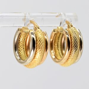 750/- yellow gold; total weight: ca. 3.3 g (not filled); semi-circular with hinged lever back; triple profiled with polished and chased surface décor; diameter: ca. 16 mm; width: ca. 6.9 mm.