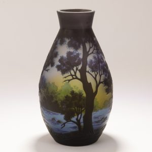 Overlaid glass, colourless and opaque in blue, yellow and violet tones; after Émile Gallé; multi-layered polychrome glass etched to create a relief motif, presumably a Vosges landscape; inscribed “Tip Gallé” on the central wall; pontil mark on the underside; base with signs of wear; height: approx. 16 cm; weight: approx. 434 g.