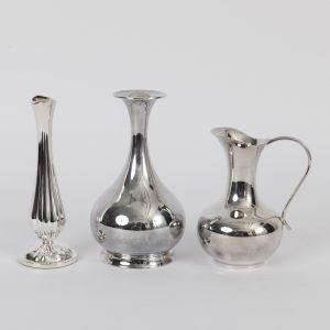 1 x 925/- (filled), 1 x 835/- silver and 1 x plated; total weight: ca. 328 g; lot comprising: 1) small vase with pear-shaped body, vertically fluted all around, with tapered shaft on convex filled base; side stamped with crescent moon and crown, maker’s mark Gayer & Krauss, Schwäbisch Gmünd, and fineness mark “925”; height: ca. 14.3 cm. 2) vase with pear-shaped body on narrow foot ring with funnel-shaped rim; underside stamped with crescent moon and crown, maker’s mark Hermann Emil, Waldstetten, and fineness mark; height: ca. 14.3 cm. 3) handled vase with compressed globular body, side-mounted handle and wide, curved spout; underside with maker’s mark Hohmann & Katz AG, Pforzheim; height: ca. 10.5 cm. All pieces with age-related signs of wear.