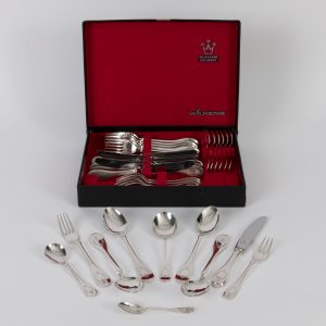800/- silver; total weight (without knives): ca. 966 g; 31-piece cutlery set “Schloß Rosenborg” in original case, comprising: 1) 6 dinner knives; some with age-related discolouration at the bolster; length: ca. 20 cm. 2) 6 dinner forks; length: ca. 17.7 cm. 3) 4 dinner spoons; length: ca. 17.8 cm. 4) 6 teaspoons; length: ca. 13.2 cm. 5) 6 cake forks; length: ca. 14.7 cm. 6) 1 soup cup spoon; various surface nicks on the bowl; length: ca. 15 cm. 7) 1 sugar spoon; length: ca. 13 cm. 8) 1 mocha spoon; length: ca. 10.5 cm. All pieces stamped with crescent moon and crown, maker’s mark and fineness mark, and with age-related signs of wear.