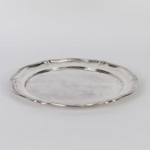 800/- silver: weight: approx. 690 g; round Chippendale serving tray with circular centre and slightly curved six-lobed rim; marked on the centre with crescent moon and crown, jeweller’s mark and fineness mark; age-related signs of wear and oxidation residues; diameter: approx. 34.7 cm.