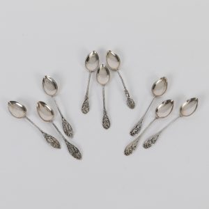 800/- silver; total weight: ca. 80 g; teaspoons with three different floral designs in openwork; narrow tapering bowls; chiselled handles in branch design; reverse of the bowl or handle stamped with fineness and maker’s mark; age-related signs of wear and oxidation residues; length: ca. 10.3 to 10.5 cm.