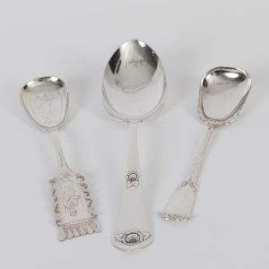 Silver alloy; total weight: ca. 164 g; three-piece lot of spoons comprising: 1) serving spoon with trapezoid bowl with ornamental décor and widening handle with hammered decoration; reverse of handle with two obliterated marks; length: ca. 19 cm. 2) serving spoon with finely chased bowl depicting a hunter and livestock, and broad handle with depiction of a person, framed at the sides by fine rings and ending geometrically at the top; reverse of handle stamped with Swedish marks incl. date letter 1953; length: ca. 21 cm. 3) dumpling spoon with raised rose décor on handle and grip; reverse of handle stamped with Copenhagen city mark and assay year (19)22 as well as assay master’s mark of Christian F. Heise; length: ca. 25 cm. Age-related signs of wear.