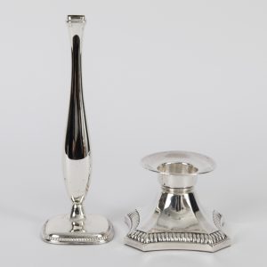 925/- silver and plated (both filled); total weight: ca. 357 g; 1) wide candlestick with flared nozzle and tapered shaft on convex quatrefoil base with circumferential fluting; side stamped with crescent moon and crown, maker’s mark and fineness mark; height: ca. 6.6 cm. 2) vase with club-shaped body, tapered shaft on square base with circumferential beaded border decoration; several surface scratches; plated; height: ca. 18.8 cm. Both pieces with age-related signs of wear.