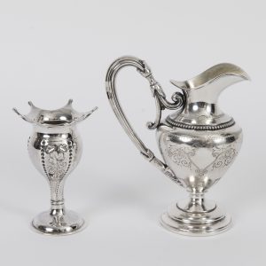 925/- and 750/- silver; total weight: ca. 210 g; 1) silver cream jug with pear-shaped body with fine chasing, on triple-stepped circular foot, large ear-shaped side handle, tapered neck and wide spout, interior with remaining gilding; foot stamped with fineness mark; height: ca. 15.5 cm. 2) small vase with globular body and tapered shaft on circular foot with crown-shaped, flared rim, circumferential floral and ornamental embossed decoration; side of the wall stamped with lion passant, city mark, maker’s mark and date letter 1901; nicks of ca. 5 mm each on the body and foot; height: ca. 11.2 cm. Both pieces with age-related signs of wear.