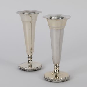 925/- silver (filled); total weight: ca. 226 g; pair of silver vases with conical body, opening into a wide, wavy rim, on circular foot with circumferential cord border decoration and tapered shaft in compressed globular form; protected against tarnishing, vague residues visible; underside of foot with felt covering; base stamped with crescent moon and crown, fineness mark and maker’s mark; surface micro-scratches and age-related signs of wear, one dent of 3 mm on the shaft of one vase; height: each ca. 13.5 cm.