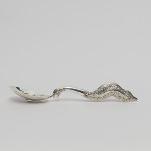 Silver alloy; weight: ca. 122 g; serving spoon with large bowl and wavy curved handle, both ends stamped and chased in ornamental forms; handle filled; seam residues and fine age-related signs of wear; length: ca. 30 cm.
