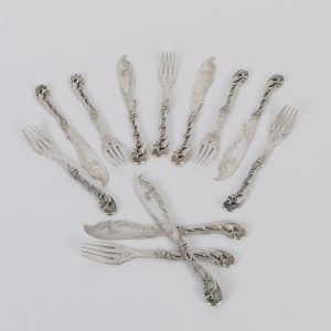 800/- silver; total weight: ca. 514 g; fish cutlery set with finely chased floral and rocaille décor in openwork on the handles; reverse of handles or blades stamped with crescent moon and crown, jeweller’s mark of Wilkens & Söhne, fineness mark and maker’s mark; age-related signs of wear; length of forks: ca. 16 cm; length of knives: ca. 17.6 cm.