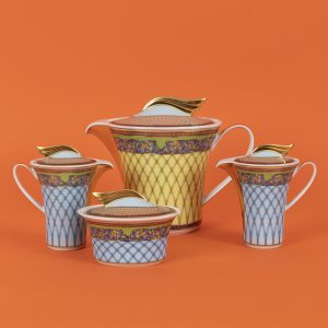 White porcelain with polychrome décor and gilt accents; form “Ikarus” by Paul Wunderlich; decoration featuring alternating diamond patterns in light blue and green tones, delicate ornamental and acanthus scrollwork on a cobalt-blue band and a surrounding border in varying patterns, framed by golden lines; all pieces of oval, slightly conical form; removable lid with handle in the shape of a stylised wing; set comprising: 1) coffee pot with curved and compressed spout; slight gold wear; dimensions: approx. 18.7 cm x 23.4 cm x 12.4 cm. 2) two cream jugs with curved and compressed spout and ear-shaped handle; dimensions: approx. 13.7 cm x 13.1 cm x 7.5 cm. 3) sugar bowl; dimensions: approx. 9.2 cm x 13.1 cm x 8.9 cm; partially with minimal tea residue; as new; underside with manufacturer’s and designer’s emblem and marks (blind stamp, model number); total weight: approx. 1.68 kg.