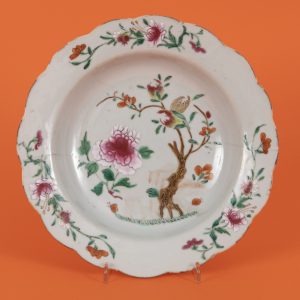Porcelain; celadon-green ground; peony tendrils on the cavetto and rim; central depiction of a garden landscape with peonies; polychrome enamel colours of the Famille Rose palette; plate with two long hairline cracks and various chips, in a condition suitable for extensive restoration; diameter: approx. 22.8 cm.