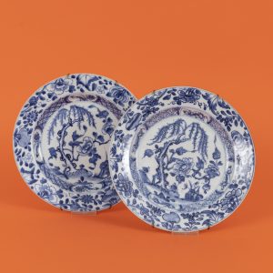 Porcelain with blue painting; the rim richly decorated with floral and fruit motifs, the centre depicting a blossoming garden landscape with an ochre-coloured border; one plate with a large glued area; various minor chips; diameter: approx. 23 cm.
