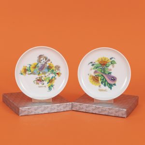 White porcelain with polychrome painting and gilt decoration; two collector’s plates with polychrome floral underglaze painting and overglaze gilding, signed; one depicting a woman playing a mandolin in oriental attire, the other a mandolin before floral décor; plates issued as part of the special edition “Concertina” for the Warsteiner Brewery in 1996; in original Rosenthal box; underside with overglaze company mark, model number and control label; diameter: approx. 11.4 cm; total weight: approx. 176 g.