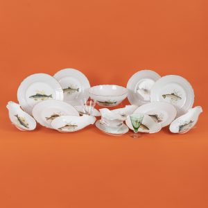 White porcelain with polychrome naturalistic motifs (fish, shells, crabs and underwater flora), gilt rims and gilt decoration; service consisting of: 6 dinner plates (D: approx. 26 cm), 6 fishbone plates in stylised fish form (L: approx. 25 cm), 1 sauce boat (L: approx. 22 cm, H: approx. 9.5 cm), 1 large bowl (H: approx. 8.4 cm, D: approx. 24.5 cm); very good condition without noteworthy signs of use; each base with the green crowned factory mark “Richard Ginori”, various letters and numbers (model numbers?) as well as “Italy”; together with 2 × 6 drinking glasses with short stem with knop and surrounding line décor on the upper third of the bowl (6 glasses with green bowl, H: approx. 11 cm; 6 colourless glasses, 3 with minimal chips on the rim, H: approx. 12.5-12.8 cm); weight of service: approx. 6.9 kg; weight of glasses: approx. 1.4 kg; total weight: approx. 8.3 kg.