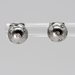 585/- white gold; total weight: approx. 2.6 g; hemispherical form each set with 7 melée brilliant-cut diamonds, total approx. 0.12 ct; colour: mid-range (G-I); clarity: mid to lower range; satin-finished surface decoration; diameter: approx. 7.8 mm; height: approx. 6.2 mm; diamonds with slight signs of wear on the facet edges.