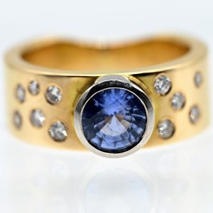 750/- yellow and white gold; total weight: approx. 13.9 g; broad, solid band form with beveled edges at the back; set in a raised white gold round bezel setting with a faceted tanzanite in a light blue-violet colour variety; diameter: approx. 7 mm; height: approx. 6 mm; on the ring shoulders, 5 and 6 brilliant-cut diamonds respectively, total approx. 0.2 ct; colour: F-H; clarity: VS1-SI; width of ring band: approx. 8.1 mm; central height: approx. 5.3 mm; ring size: 54.