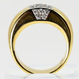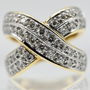 585/- yellow gold; total weight: approx. 11.7 g; two crossed bands on the front and back; front set with 40 brilliant-cut diamonds, total approx. 1.0 ct (according to engraving); colour: F-H; clarity: VVSI-VSI; width of ring centre: approx. 16.9 mm; ring size: 53.5.