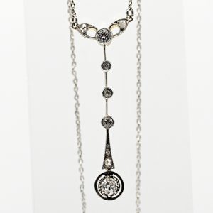 585/- yellow and white gold; total weight: approx. 4.4 g; pendant in small, stylised bow form, suspended from it a multi-linked, movable drop-shaped diamond-set pendant; 5 set old-cut diamonds and 4 diamond roses, total approx. 0.4 ct; colour and clarity: mid-range; length of pendant: approx. 44 mm; fine anchor chain necklace with box clasp, safety catch and chain; total length: approx. 41 cm.