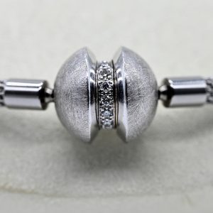 750/- white and yellow gold and steel spring; total weight of the clasp: approx. 10.4 g; triple-divided ball clasp with bayonet mechanism; can be worn variably by pressing on both sides, either with the golden band or with 15 set brilliant-cut diamonds, total approx. 0.21 ct; colour: TW; clarity: SI; information according to standard trade list; satin-finished and polished surface; dimensions: diameter: approx. 13.9 mm; length: approx. 14.8 mm.