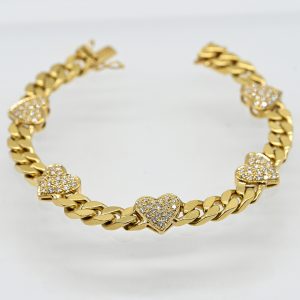 750/- yellow gold; total weight: approx. 41.6 g; curb link bracelet divided by 5 hearts with a total of approx. 95 brilliant-cut diamonds, total approx. 2 ct; colour: F-H; clarity: VVSI-VSI; each heart measuring approx. 11.9 x 12.2 mm; width of bracelet: approx. 6.8 mm; concealed box clasp with side safety catches; total length: approx. 19.5 cm.