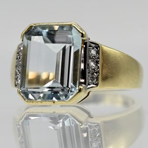 585/- yellow gold; total weight: approx. 5.1 g; rectangular faceted aquamarine set vertically (11.8 x 9.7 x 5.7 mm), approx. 4.6 ct; shoulders each set with 3 melée brilliant-cut diamonds, total approx. 0.06 ct (according to engraving); plain, tapering shank; dimensions of ring centre: approx. 12.6 x 14.6 mm; height: approx. 5.6 mm; ring size: 54.5.