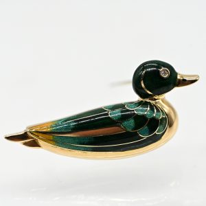 750/- yellow gold; total weight: approx. 9.9 g; semi-plastic duck form, contoured with graded green and ochre enamel tones; eye set with a small diamond of approx. 0.02 ct; colour and clarity in the upper range; dimensions: approx. 46.7 x 20.8 mm; height: approx. 7.1 mm; closed back.