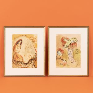 Pair of color lithographs on paper; “Ruth Gleaning” and “Rachel Steals the Idols of Her Father” from 1960, from Chagall’s Bible series; combination of Expressionism and Surrealism in ochre, blue, and orange tones, accented with black. 1) Depiction of the biblical figure Ruth gleaning ears of corn in a rustic, archaic setting, surrounded by vegetal suggestions and a figure; catalogue raisonné: Mourlot 246. 2) Depiction of Rachel in a narrative scene from the Old Testament, surrounded by animal forms, fluid transitions, and a figure; catalogue raisonné: Mourlot 242. Both in cream-colored Passepartout with linen structure, under glass, in narrow profiled gilt frames, not opened; image section dimensions: approx. 43.7 x 25.3 cm; frame dimensions: approx. 52.2 x 41.8 cm; total weight: approx. 2.9 kg.