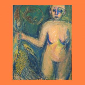 Oil on canvas; expressionist, colouristic depiction of a nude female figure with a bald head, holding a goose by the neck in one hand, next to its beak a hovering head looking downwards incorporated in sgraffito; impasto application of paint; signed and dated centre bottom “Korber 91”; minor paint abrasions; painting dimensions: ca. 170 x 135 cm; weight: ca. 4.9 kg.