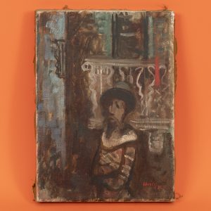 Oil on canvas; “Don Quixote” from 1937; expressive figurative depiction of the Spanish novel hero Don Quixote as a half-figure in half-profile in front of an architectural backdrop; signed and dated lower right; Schröers was a member of the Rhenish Secession; linen canvas partially frayed at the cut edges; good condition consistent with age; painting dimensions: approx. 33 x 24 cm; weight: approx. 400 g.