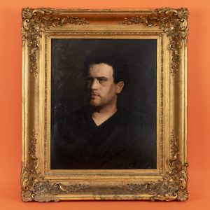 Oil on artist’s board, relined; realistic portrait painting; male portrait; shoulder-length depiction in half-profile; portrayal of a middle-aged man in dark clothing against a dark background; several restoration traces, especially in the lower area of the painting; reverse inscribed in pencil “Schlabitz Berlin” and with two numbered paper labels; gilded ornate frame with floral and ornamental décor; age-related signs of wear; painting dimensions: approx. 59 x 47 cm; frame dimensions: approx. 82 x 72 cm; weight: approx. 7.6 kg.