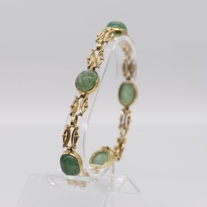 585/- yellow gold; total weight: approx. 18.4 g; five amazonite cabochons set in plain, narrow bezel settings, each separated by two ornamental openwork links; concealed box clasp; bracelet width: approx. 10.4 mm; link width: approx. 8.5 mm; total length: approx. 20.5 cm; one cabochon with slight signs of wear on the surface.